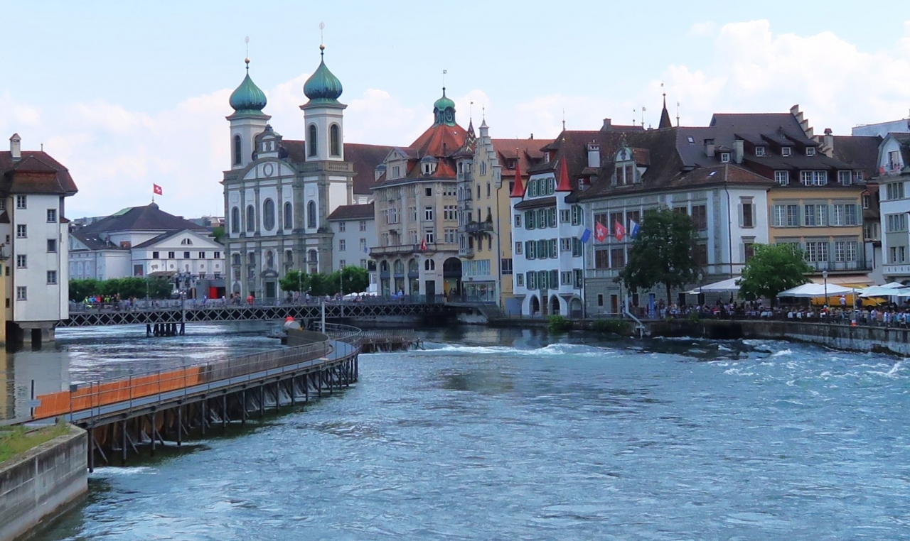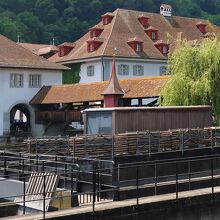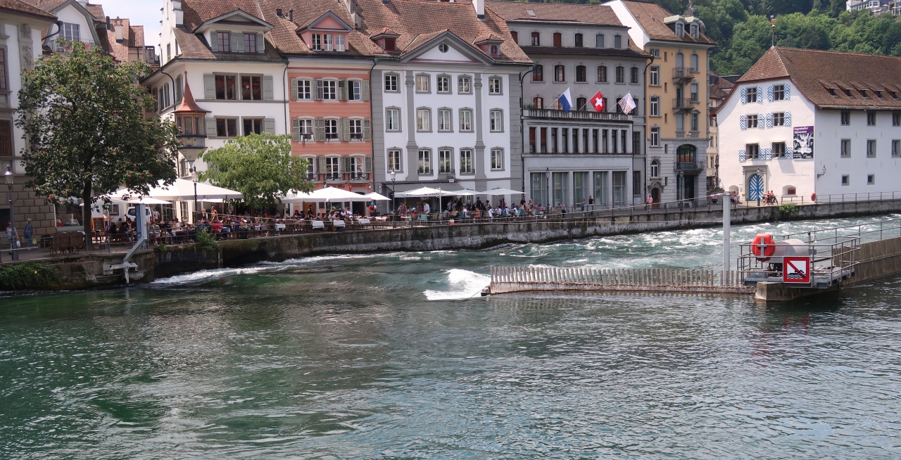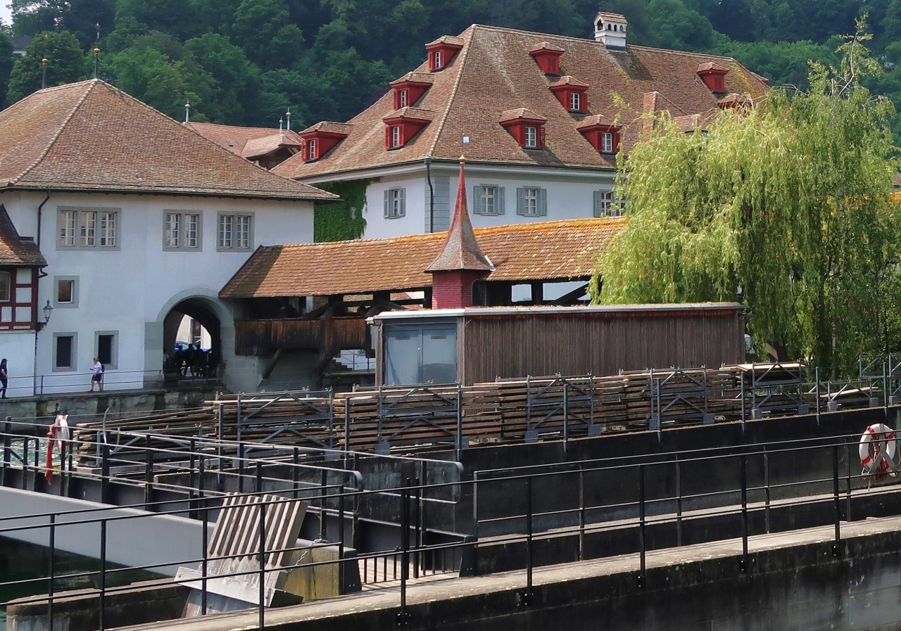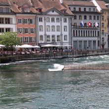 19世紀に建設されたニードル堰で、シュプロイヤー橋とロイス橋の間にありました。遠目には櫛のように見える木の細い板(=ニードル)を手作業で抜き差しすることでロイス川の流れを調節し、ルツェルン湖の水位を最適な水位に維持しているそうです。シュプロイヤー橋の脇に、ニードルの保管スペースもありました。対岸では、ロイス川の堰を見ながら大勢の人々が食事を楽しんでいました。