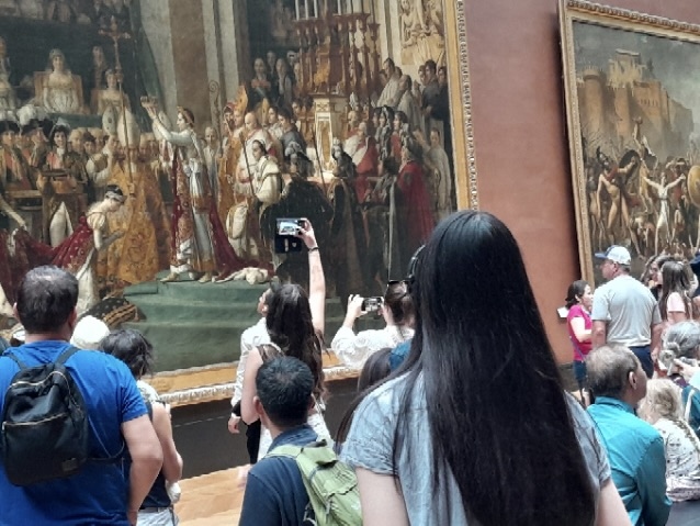 とにかくただっぴろい敷地に、これでもかというほどのロココ調というか、ゴテゴテの建物が建てられておりました。入場するところに制限が設けられており、ピラミッドのところから入りましたが、そこでも5重くらいの列ができており、入場するには、事前にアプリで予約が必要です。その日の予約が埋まってしまっていれば、直接行ったところで入れません。なんとかそれをクリアして、無事に入りましたが、人の多いこと。また、入り口までの間に、アラブの服を着た女性が慣れ慣れしく、「自撮りをしてるんだけど、うまくできないから、撮ってくれない?」と言って近づいてきます。一瞬、撮ってあげようかと思い、相手の電話を受け取ろうとしたのですが、もう少し離れたところにも、アラブの服を着た別の女性が、同じように、観光客に声をかけている(「自撮りがうまくいかないから手伝って」的な身振り手振りが見えた)のを見て、本能的に「やばい」と思いました。無視をするのが一番、と思い、無視をしましたが、すぐに別の人に乗り換えて声がけをしていました。そしてやっぱり断られていました。なんか、怪しいです。君子危きに近寄らず、です。美術館の中は最高でした。モナリザ、ナポレオンの戴冠式など、超有名なものもいいですが、メソポタミア関連の展示品なども、クオリティが高く、半日どころか、3日通っても飽きないでしょうね。