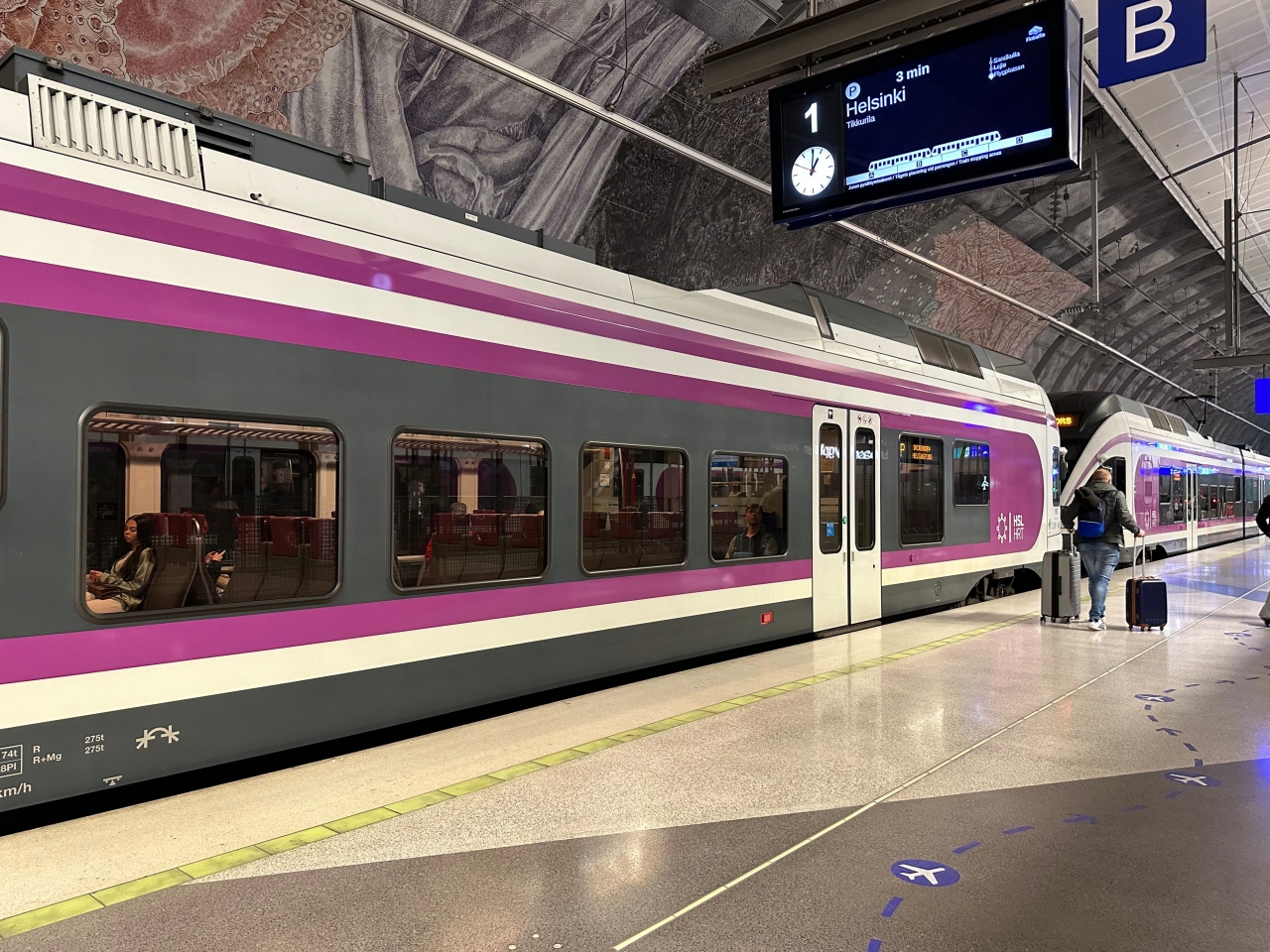 ヘルシンキ中央駅から環状運転をしている鉄道(Ring Rail Line)のI線もしくはP線に乗ると、30分ほどで空港駅(Lentoasema)に到着します。