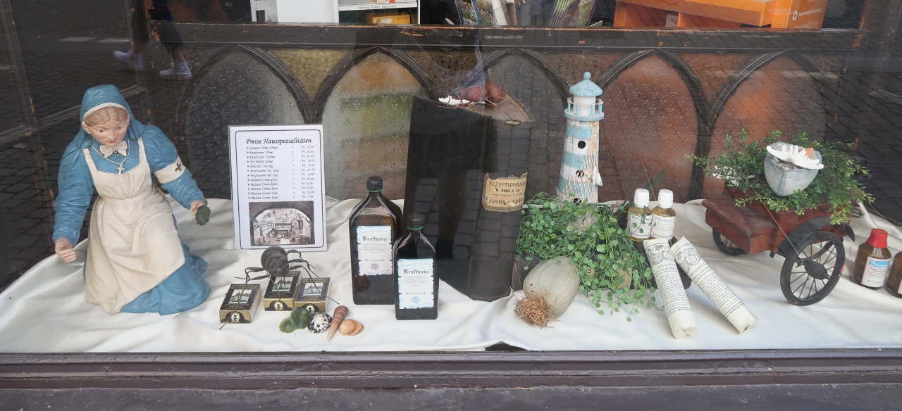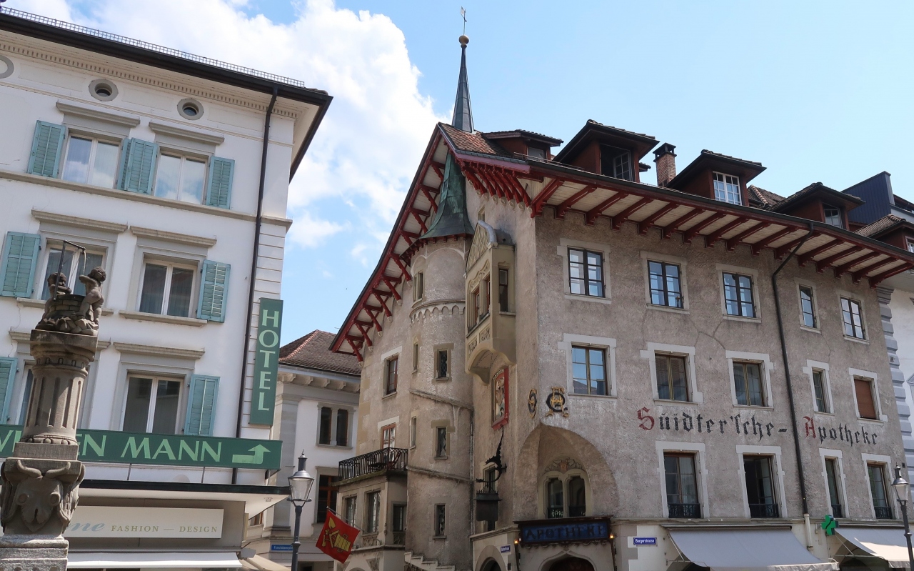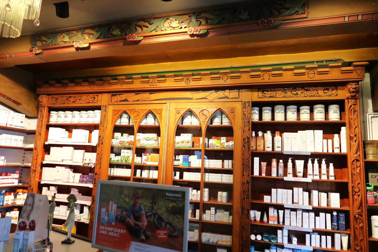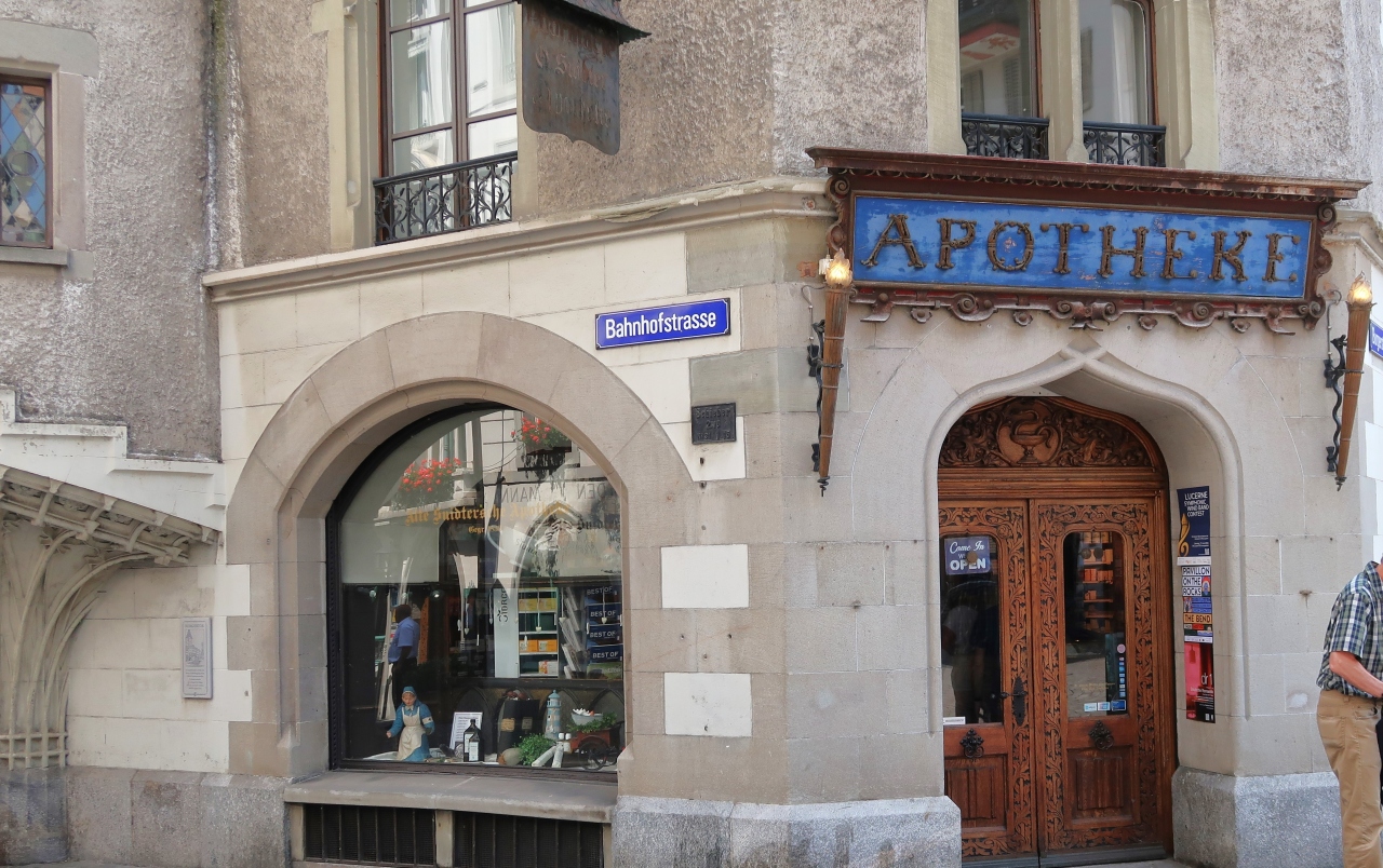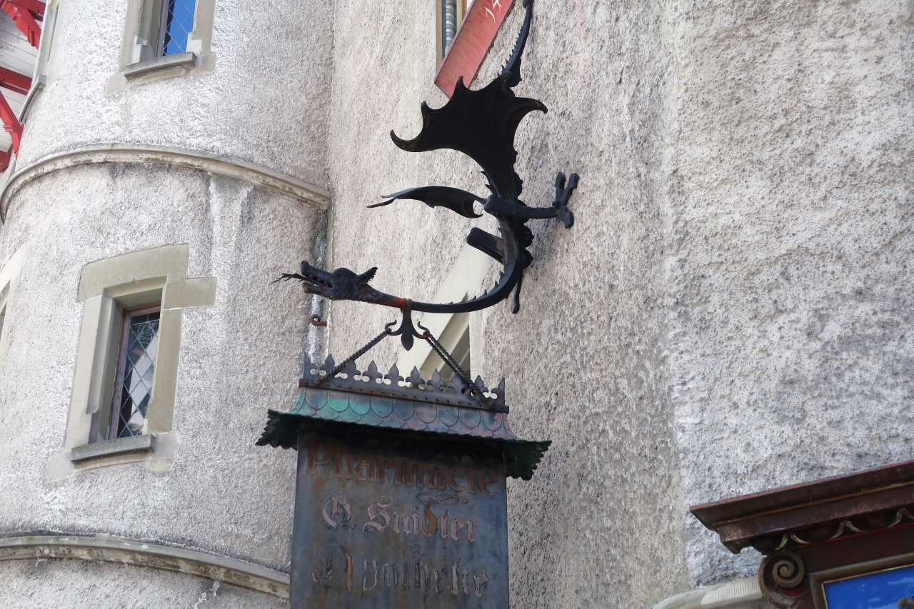 1833年創業、ルツェルン最古の薬局です。ハリー・ポッターの世界から抜け出てきたような魅力的な外観です。お店の看板もドラゴンが支えていました。店内に入っても錬金術師の実験室のような期待を裏切らないインテリアで、商品も美しい棚に並んでいました。創業者から引き継いだ秘密のレシピで作られる自然治癒力を高める薬の数々で、ルツェルン市民はコロナを予防したのかもしれません。