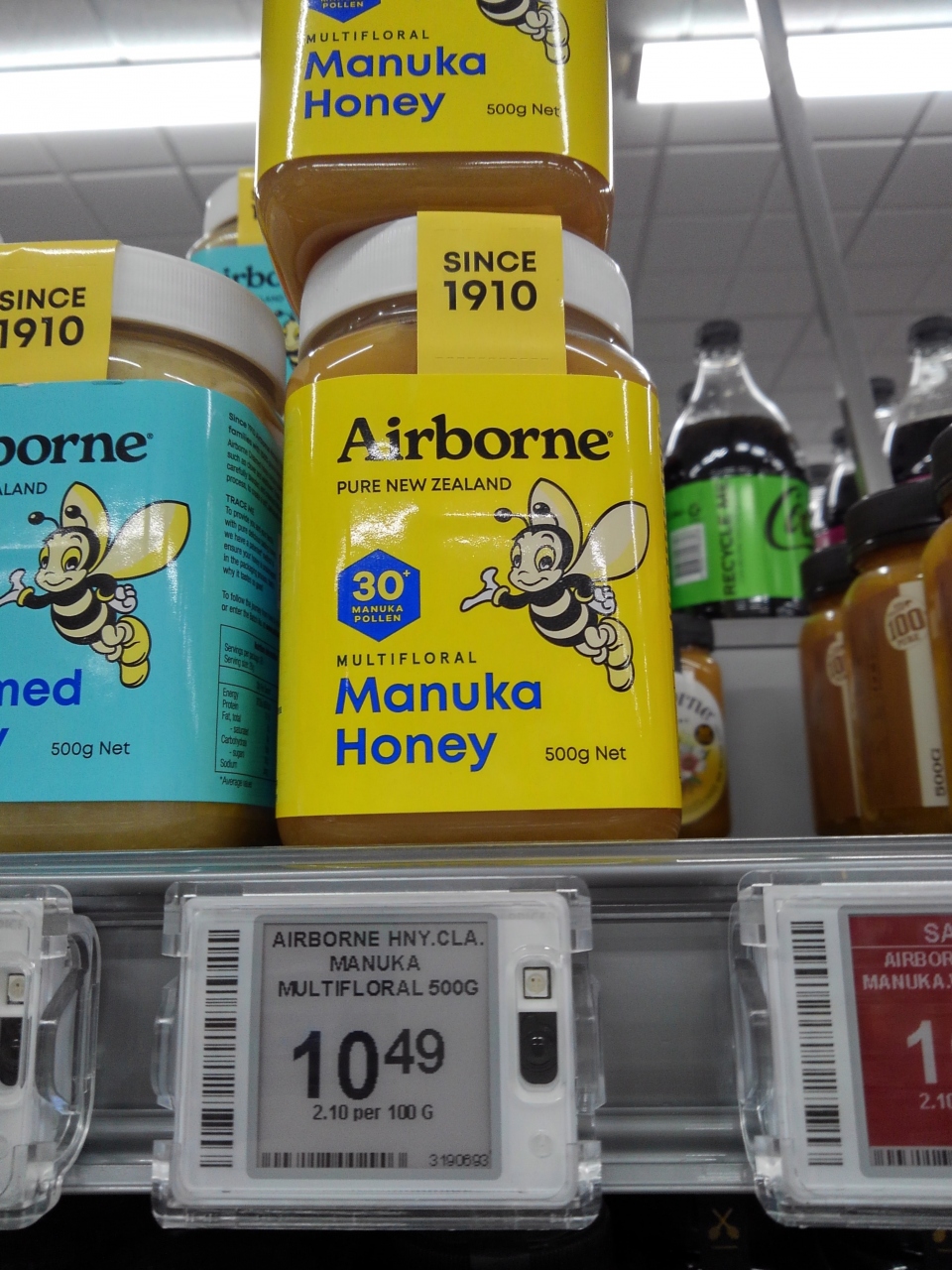 「テカポ湖」の湖畔、観光案内所から歩いて数分程度、観光の中心的なところの端に位置しています。念のため、マヌカハニーはないかと店内を見渡すと、10.49ニュージーランドドルとビックリ!よく見ると30%含有のようです。これしかないところをみると、スーパー利用の庶民的な人の食卓が感じとれたようでした。