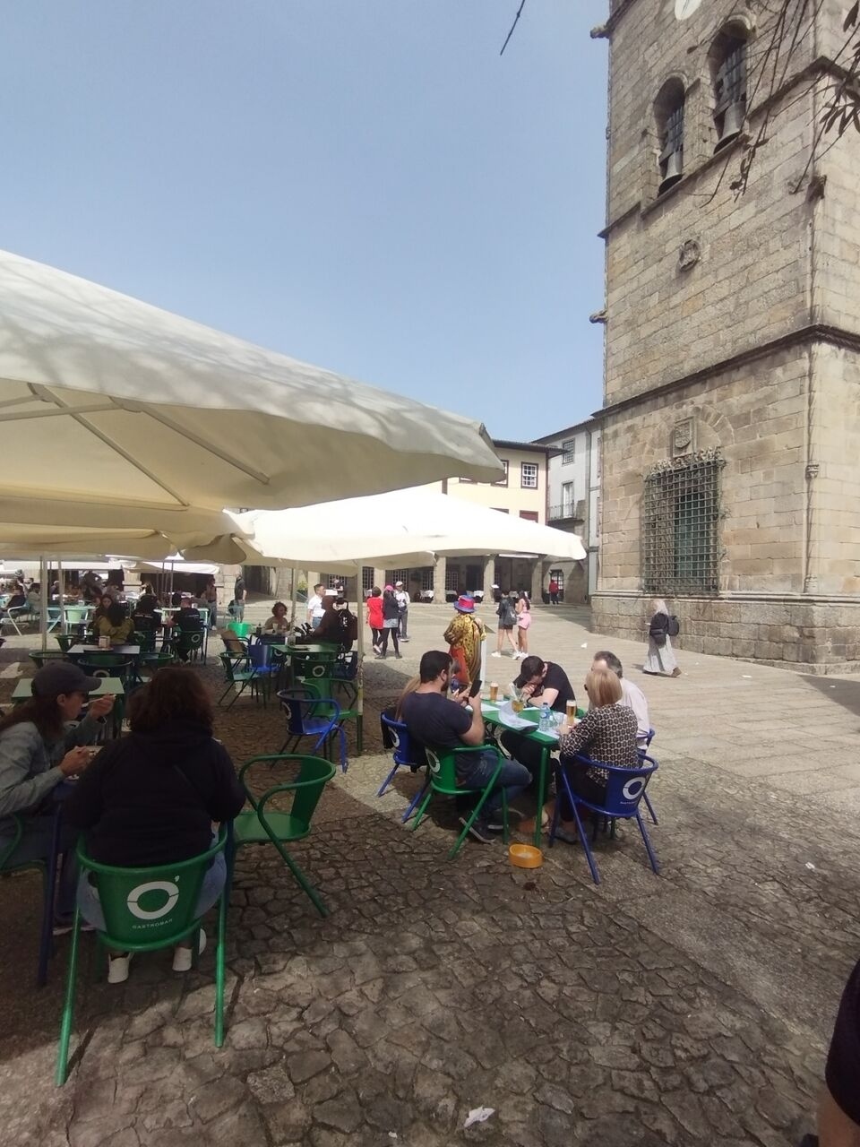 教会の前は賑やかな広場はオリベイラ広場です。晴天に恵まれ、白いパラソルの下で休憩の人が沢山いました。お勧めの休憩スポットです。