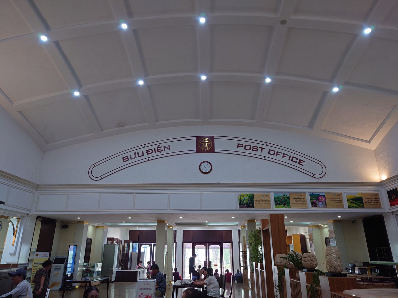 立派な建物で中は天井も高く素敵な雰囲気でした。テーブルと椅子がいくつかありましたが、地元のお年寄りの方がたくさんくつろいでいて、座ってお手紙を書くスペースはありませんでした。(エアコンがきいてるので涼んでいるんだと思います)