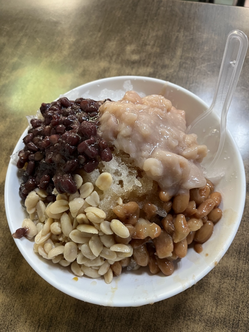 小規模でローカルな夜市ですが、ビブグルマンに認定された屋台が多い、台湾B級グルメの宝庫です。観光客は少なく、現地の人たちでごった返しており、通路を歩くのも大変です。人気店には長蛇の行列が出来ており、1時間以上待つのもザラですね。ローカルな夜市なので、近隣に最寄りの駅等はなくタクシーで乗り付けました。まずは、南機場芋頭大王で、画像のかき氷を食べることにしました。値段によりトッピングの数を選ぶことができ、今回は4種盛りとしました。とても美味しかったのですが、量も多かったので食べきるのに苦労しました。周りの現地の方を見ると、2人でとか家族で一つのかき氷を食べている人が多かったですね。