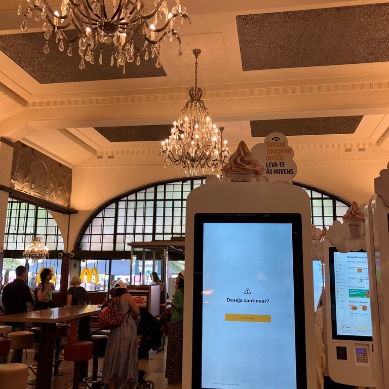 「世界で最もゴージャス」と言われているマクドナルドです。入口部分には鷲の紋章、中に入るとシャンデリアがあって、それなりの豪華です。お昼時なので混雑していました。タッチパネルでの注文は、英語に切り替えができ、タッチ決済ができました。地下のトイレを利用する時は、レシート提示が必要です。