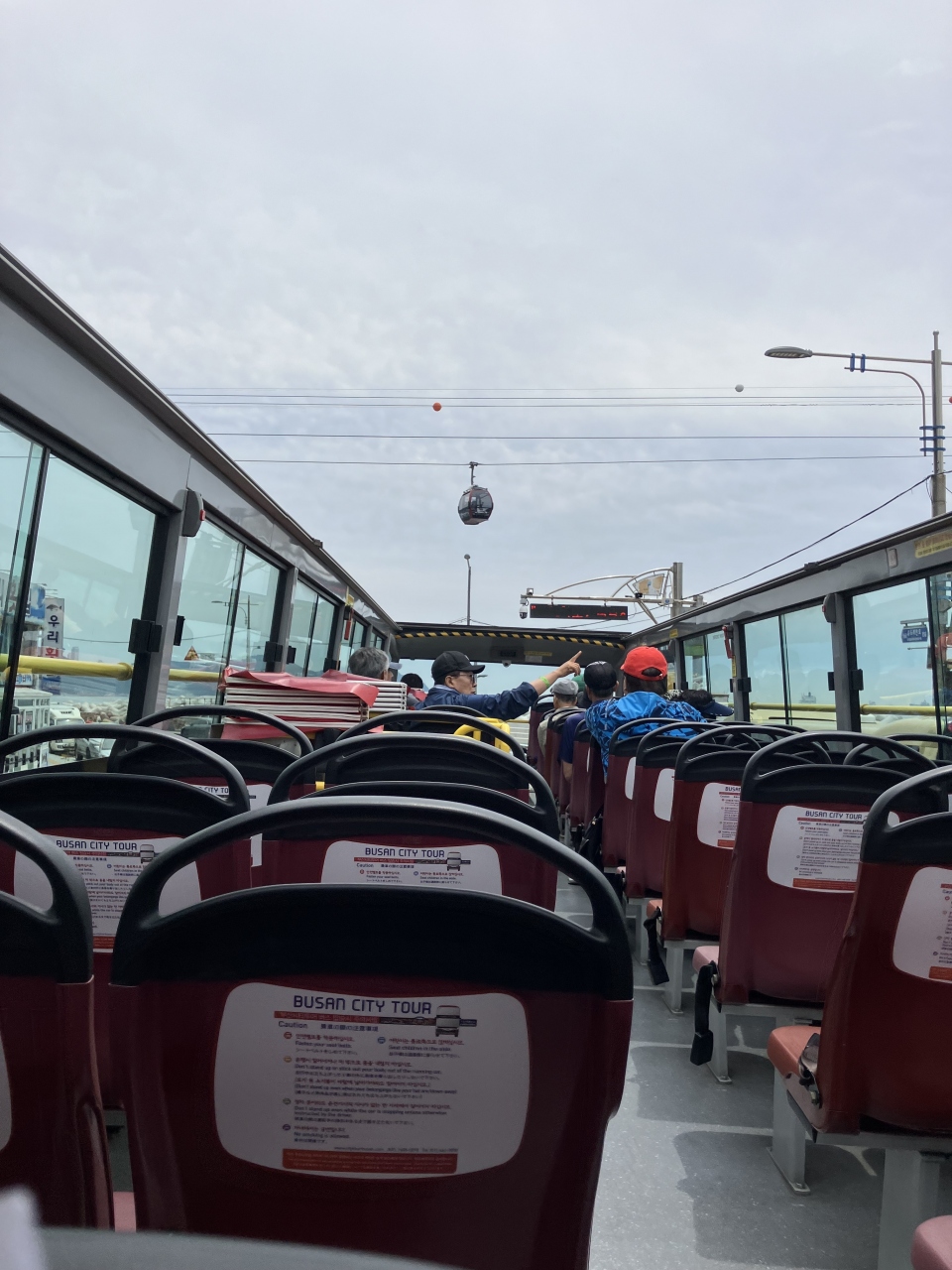 釜山ではいつも地下鉄やバスを使って移動。今回2階建ての高い場所から街並みが観光でき、蒸し暑い時期車内のクーラーが快適。オレンジコースの後グリーンコースに乗換する際、バス本体のオイル漏れで急遽不通のアクシデント。他のコースで移動しましたが、バスの自動アナウンスでは最新情報を伝えないので観光客に不親切だと思う。市内バスは停留所に時刻表示されているが、観光バスにはないので最新情報がネットすら検索できない。