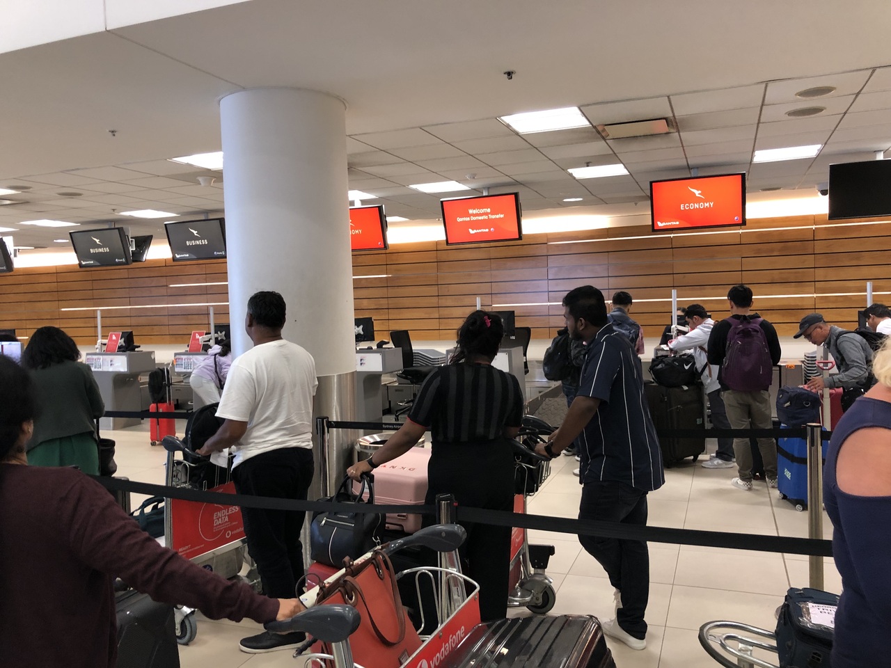 国際線ターミナルビル(第1ターミナル)自体は小さ目なのでそんなに迷う事は有りません。QF国内線は第3ターミナルからの出発なので滑走路を挟んだ対岸のターミナル迄移動になります。