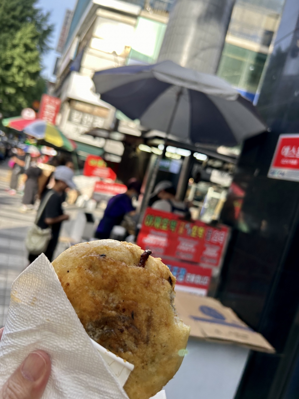 普通のホットクと小豆のホットクもありました。中でも一番人気は野菜のホットク。アッツアツのをその場で食べました。中身はチャプチェでもう美味しいのなんのって!