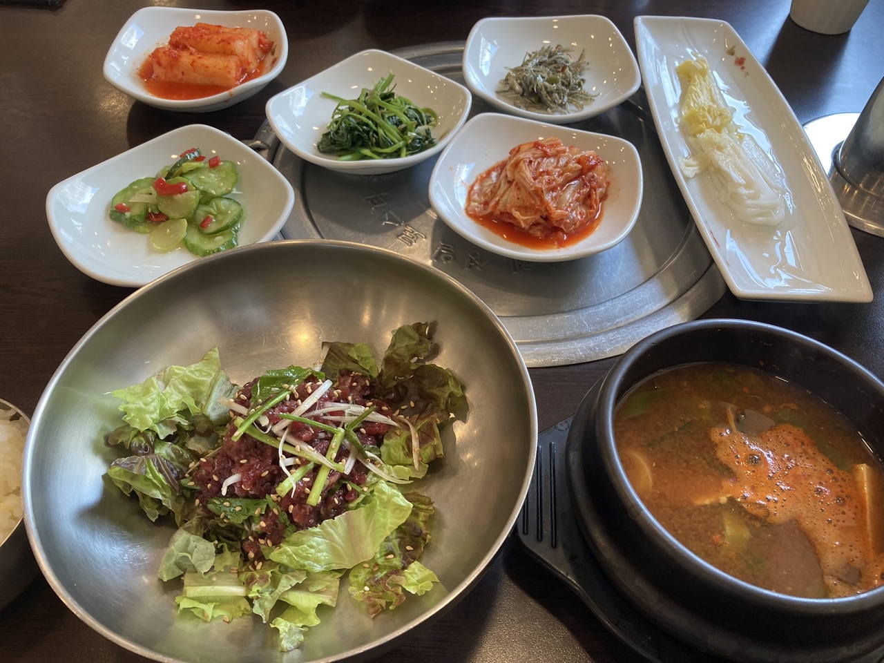 コロナ前から気になっていたお店で5月にやっと行ってきました。狎鴎亭駅から歩いて行き遠かったー。清潭駅が近いようです。24時間営業でお客さんが多い食事の時間帯を外して行けます。念願のユッケビビンバはごま油に塩とシンプルな味付けです。食べる前に物足りないのでは?と思いましたが食べたらこの味付けがいい!肉の旨みも引き立ち美味しく頂きました。行った知り合い達は全員ここのユッケビビンバ絶賛しています。カルビタンや他のメニューも食べてみたいです。