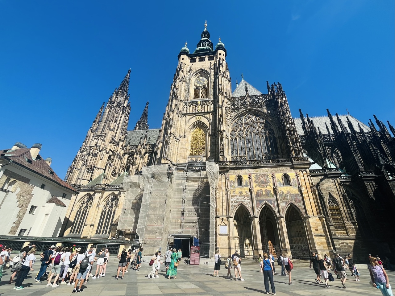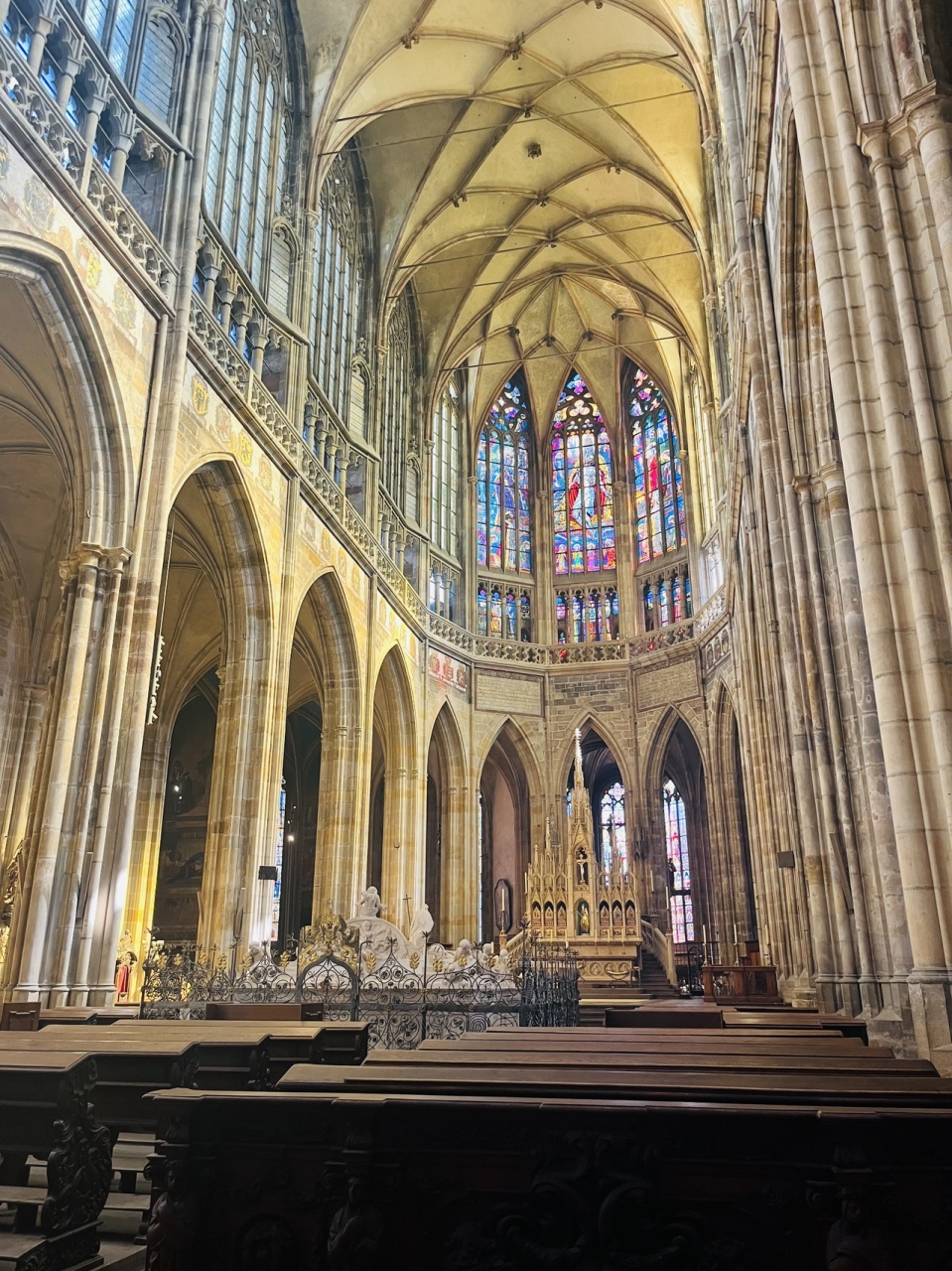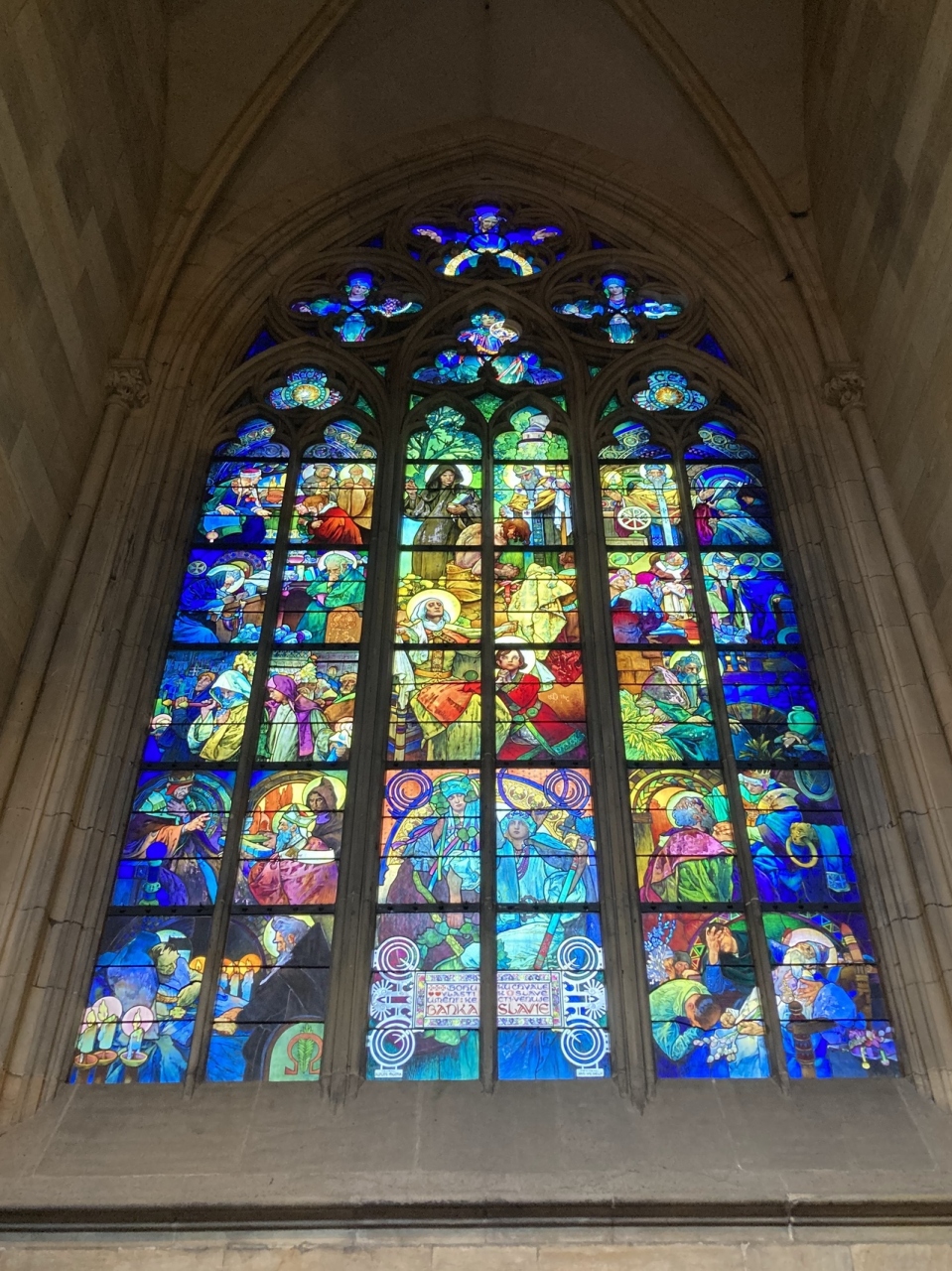 たくさんの色とりどりのステンドグラスが美しいです。その中の一つに、プラハ出身のミュシャが手掛けたステンドグラスも。