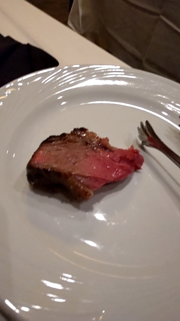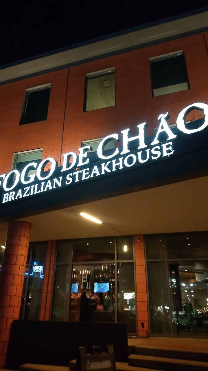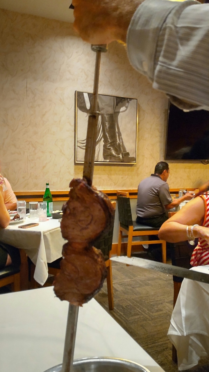 エンタメ感のたっぷりあるステーキハウスです、シカゴ郊外のオヘア国際空港近く、ローズモントの街なかにあります、サラダバーでサラダや惣菜を盛り放題、机のプレートをひっくり返してにくいが要るか要らないかを意思表示、please にしておくと次から次へ串刺しの肉がやってきて、削ぎ落としてもらい肉を自らトングで受け取ります。食べきれないくらいのブラジリアンステーキを堪能