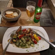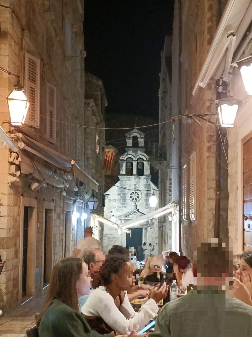 ドブロブニクの目抜き通りである【プラツァ通り】から見ると、山側に向かって東西に平行に走るかたちになっている【プリェコ通り】を夜訪れると、何軒もの飲食店がテーブルを出しており、観光客で大変に賑わっていました。どこで食事をしようかと迷いながら歩いていると、東端の【聖二コラ教会】の手前にあるしゃれた雰囲気のこちらのレストランが目に留まりました。お値段はドブロブニクにしては手ごろなのか、隣には若者のグループが利用していました。丁度2人用のテーブルが空いており、待つこともなくテーブルに着くことが出来ました。私は先述の黒く煤けて雰囲気のある【聖二コラ教会】を見ながら、シーフード中心のお料理を楽しみました。ドリンクも頼んでお値段は30ユーロ程でした。
