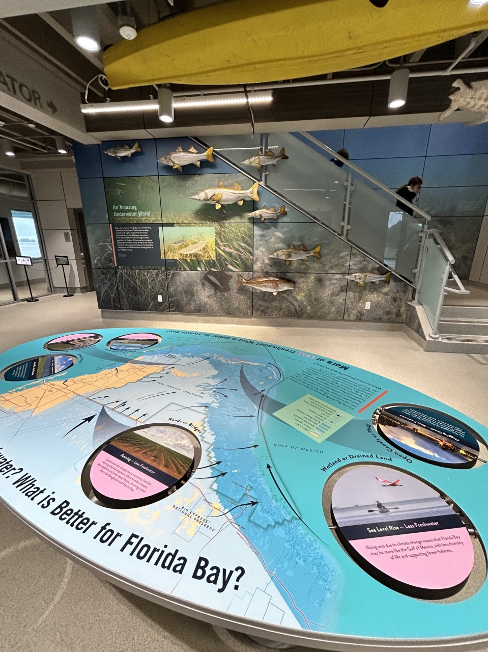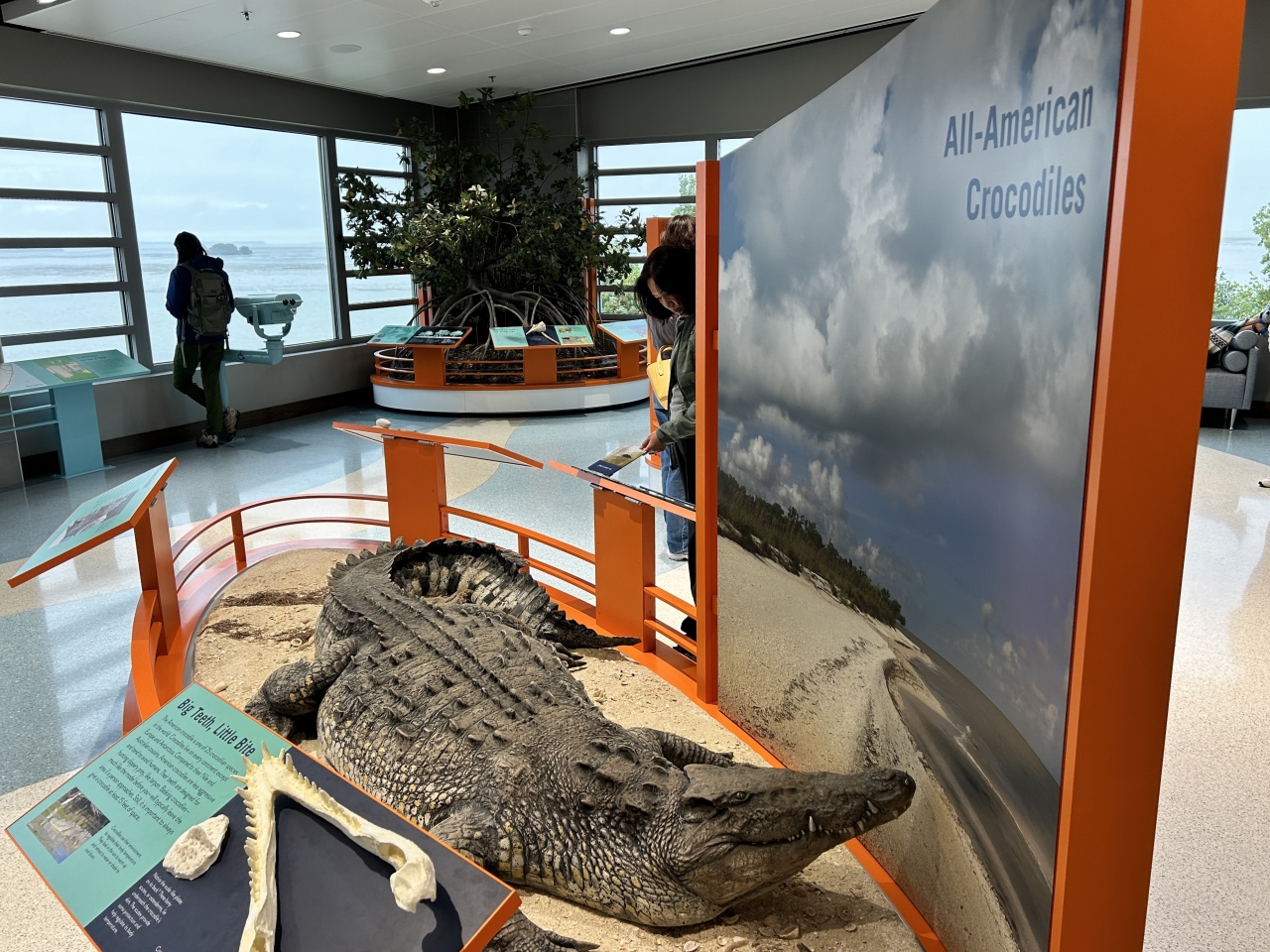 エバーグレーズ国立公園の最南端地区「フラミンゴ」のビジターセンターです。ホームステッドの公園の入口からは40マイル弱あるので45分ほどかかります。結構大きくてきれいなビジター・センターで、マナティやクロコダイルといった野生動物の紹介、先住民の生活の名残のカヌーなど、エバーグレースについて学べます。