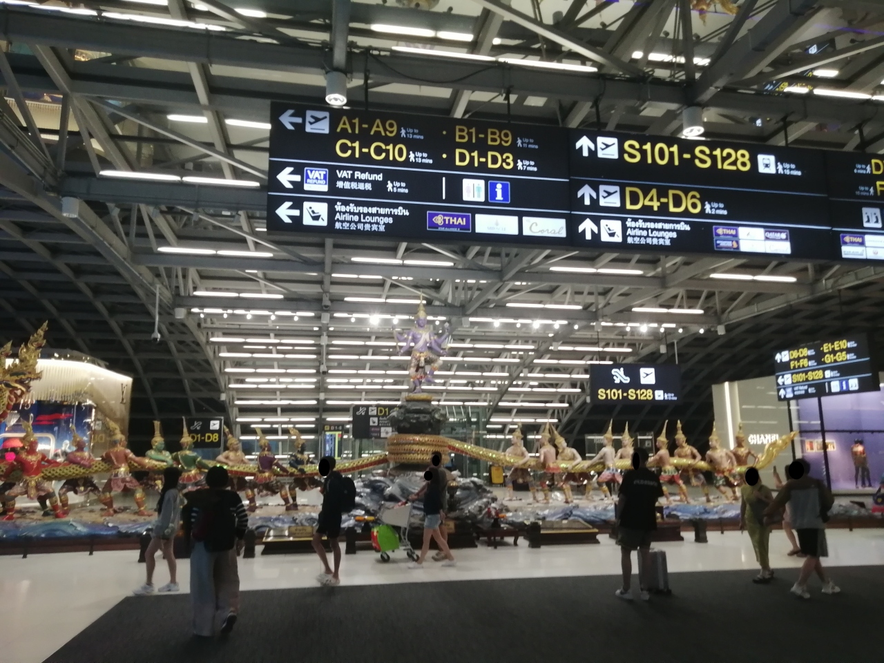 タイの首都空港だけあってかなり広く、羽田からの全日空便の到着ゲートがかなり遠かった。帰路は見込んでいたほど渋滞がひどくなかったので、チェックイン開始前に到着してしまったが、制限区域外で時間をつぶすところがあまりなく、ちょっと困った。