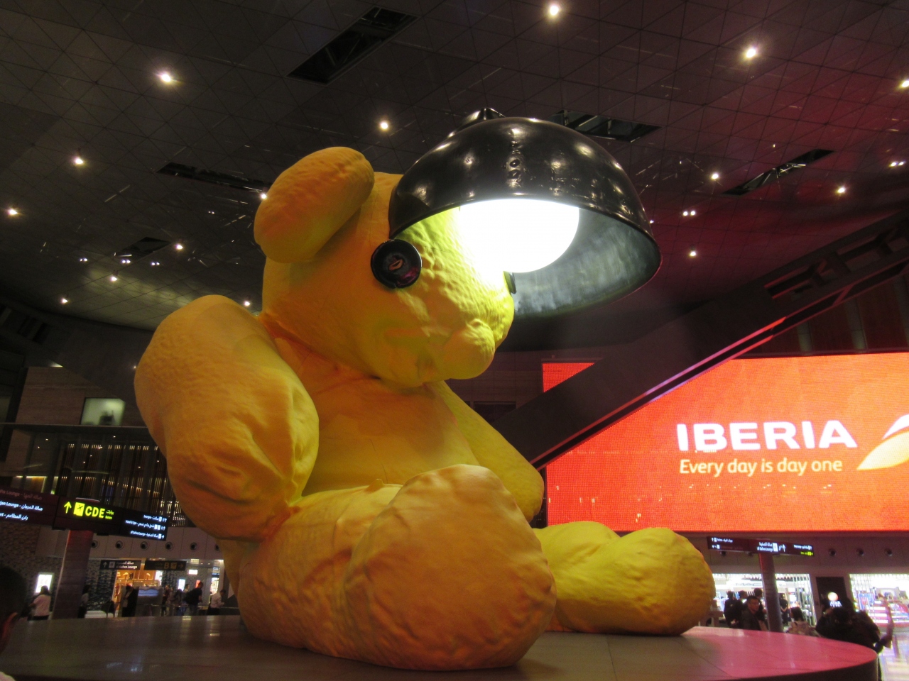 日本からの到着時に、手荷物検査の後に搭乗ゲートに向かおうとすると、少し後ろの方に有名な黄色い巨大なランプベアーが見えたので行ってみました。