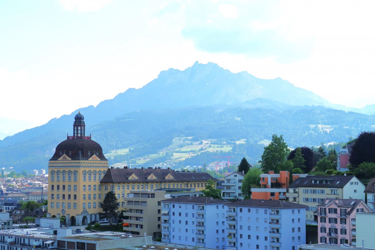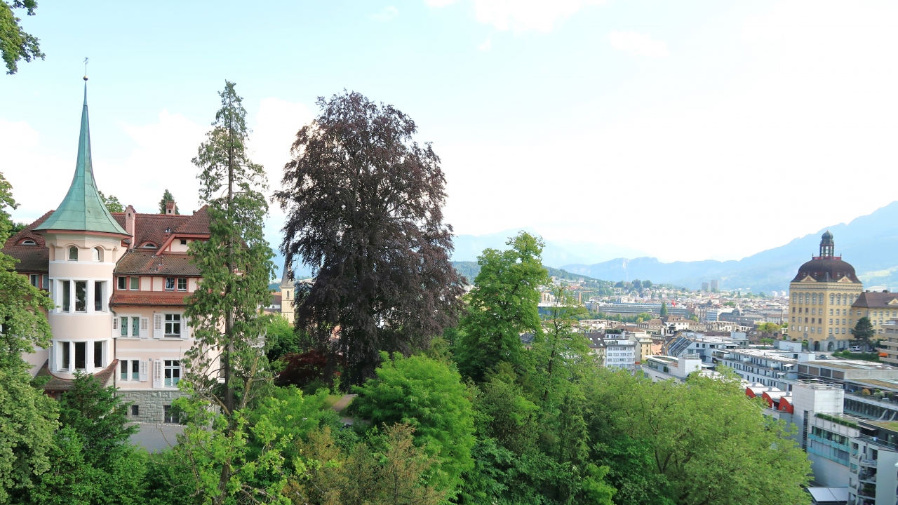 ミュージアムの向かいから岩山の地下に入れ、途中にあったエレベーターに乗ると、岩山の上のアルペンパークに出ました。パーク内にはスイス最古の展望塔があり、ピラトゥス山や、眼下の樹の枝で安心して歌を披露しているブラックバードの姿も見えました。