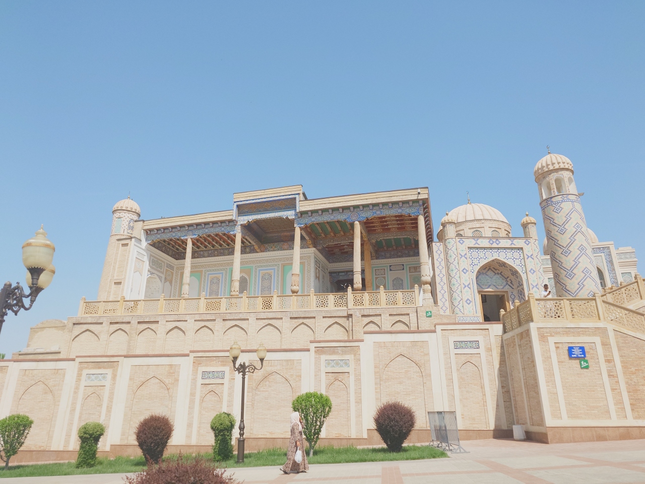 ビビハニム・モスクの近くにあります。幹線道路の上をペデストリアンデッキを渡って歩いていくことができます。丘の上にあり、木造の柱が並んだ回廊やドームを下から眺められます。ウズベキスタンの初代大統領の廟もあって、お参りする人がたくさんいました。