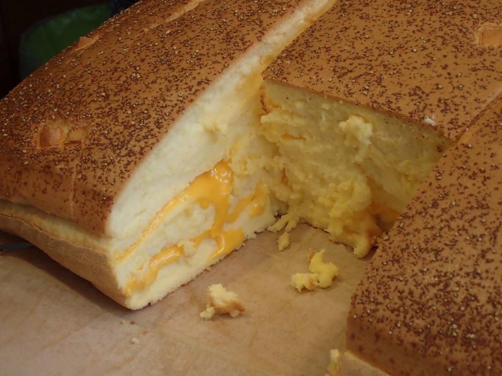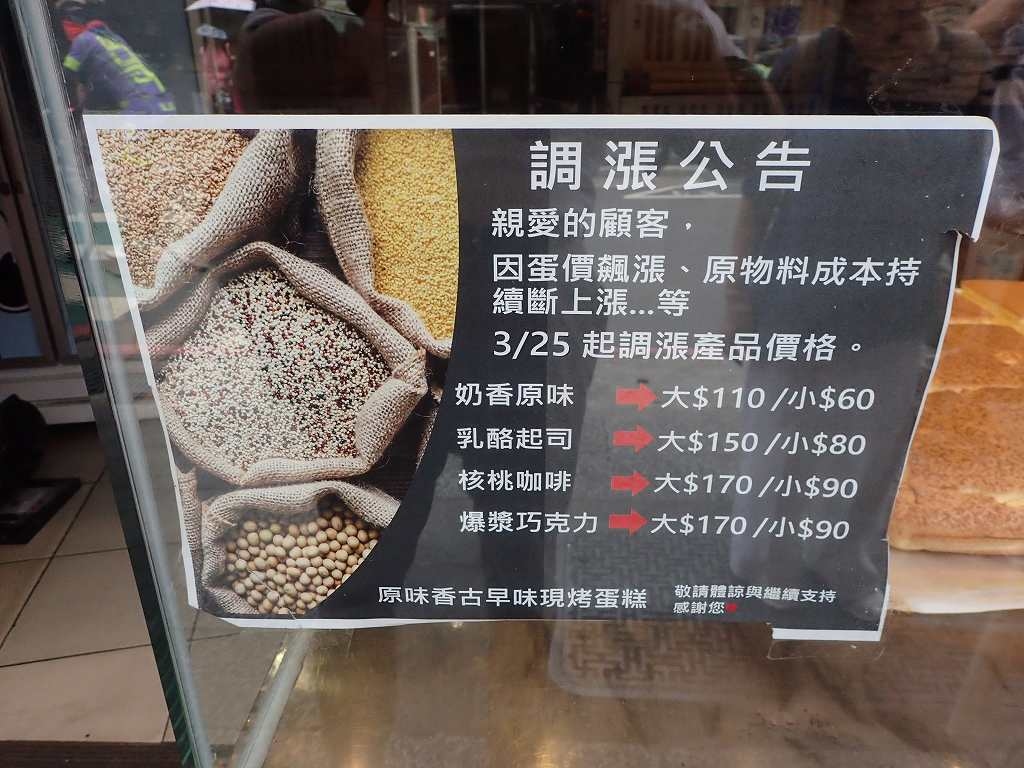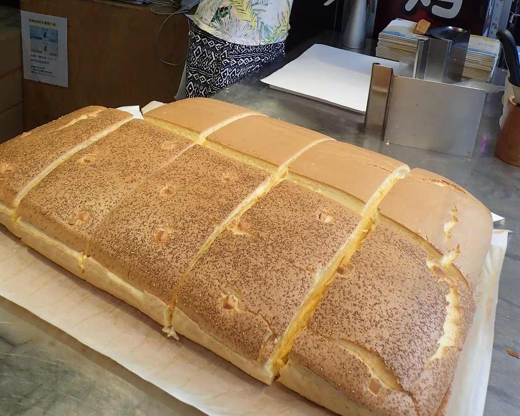 座布団より大きく厚いカステラを碁盤の目のように切って小分けする。そのひとつ一つを客が次々と買っていく。大きさと中身によって、60元から170元。日本円で300円から800円程度と手ごろな値段だった。