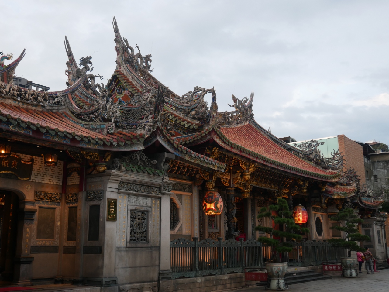 龍山寺に入ってすぐの場所にある大きな建物です。右側から中に入り奥のほうに行きます。奥側では参拝者がお供えをしたり、お祈りをしている様子がうかがえます。
