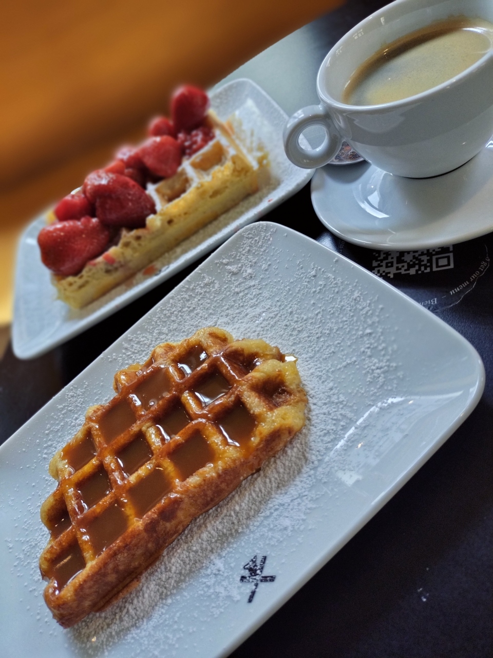 行列するお店と聞いていましたが、通りかかるとテイクアウトは少し並んでいましたが、2階の喫茶室は空いていました。クリームのかからないシンプルなワッフルをいただきました。甘さは控えめで、さっぱりとしていました。キャラメルの香りがとてもよかったです。