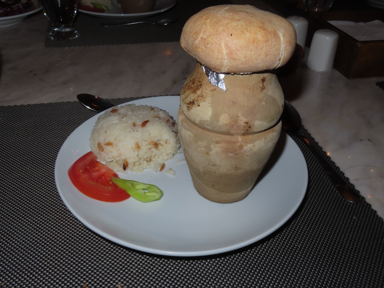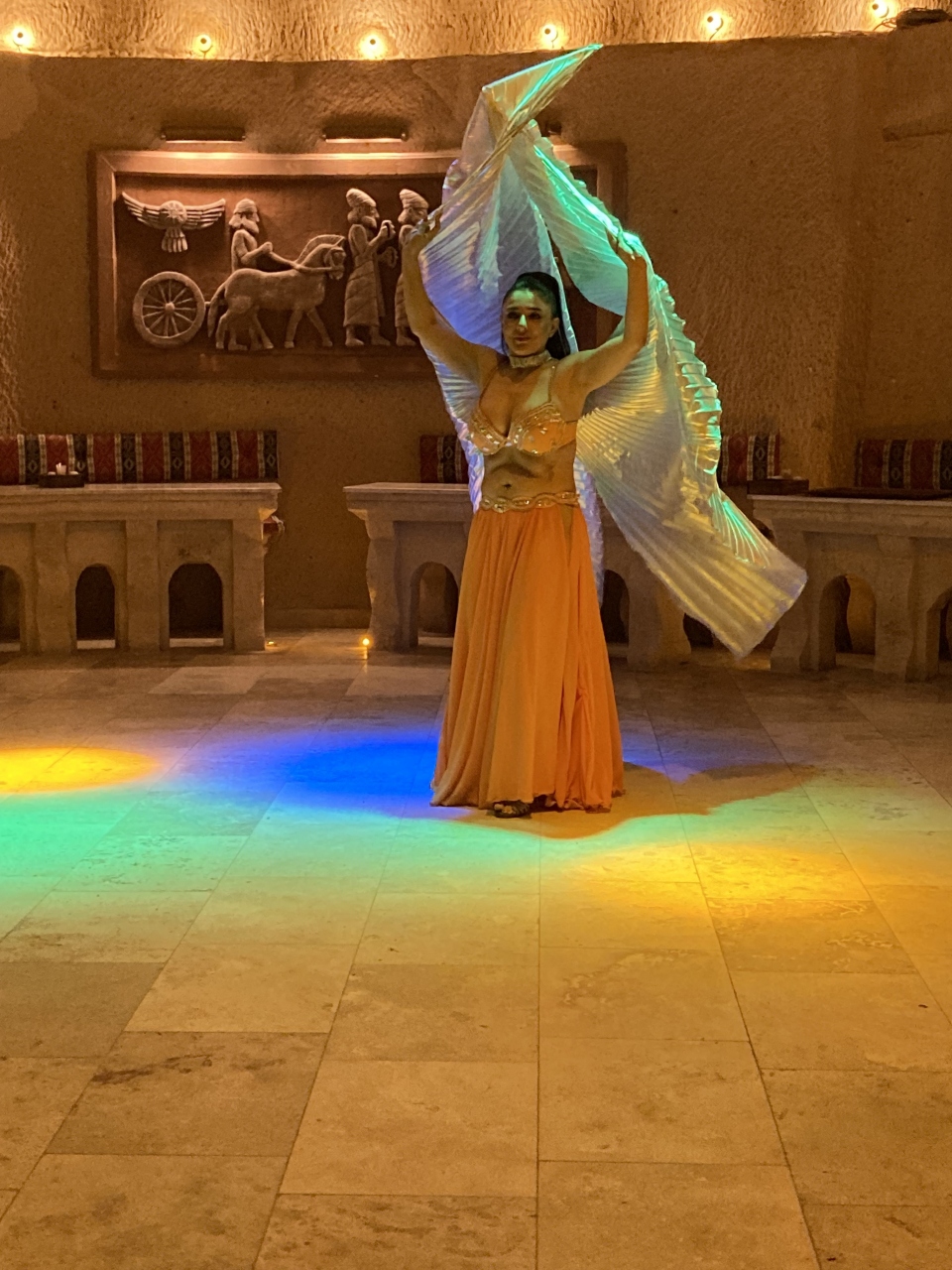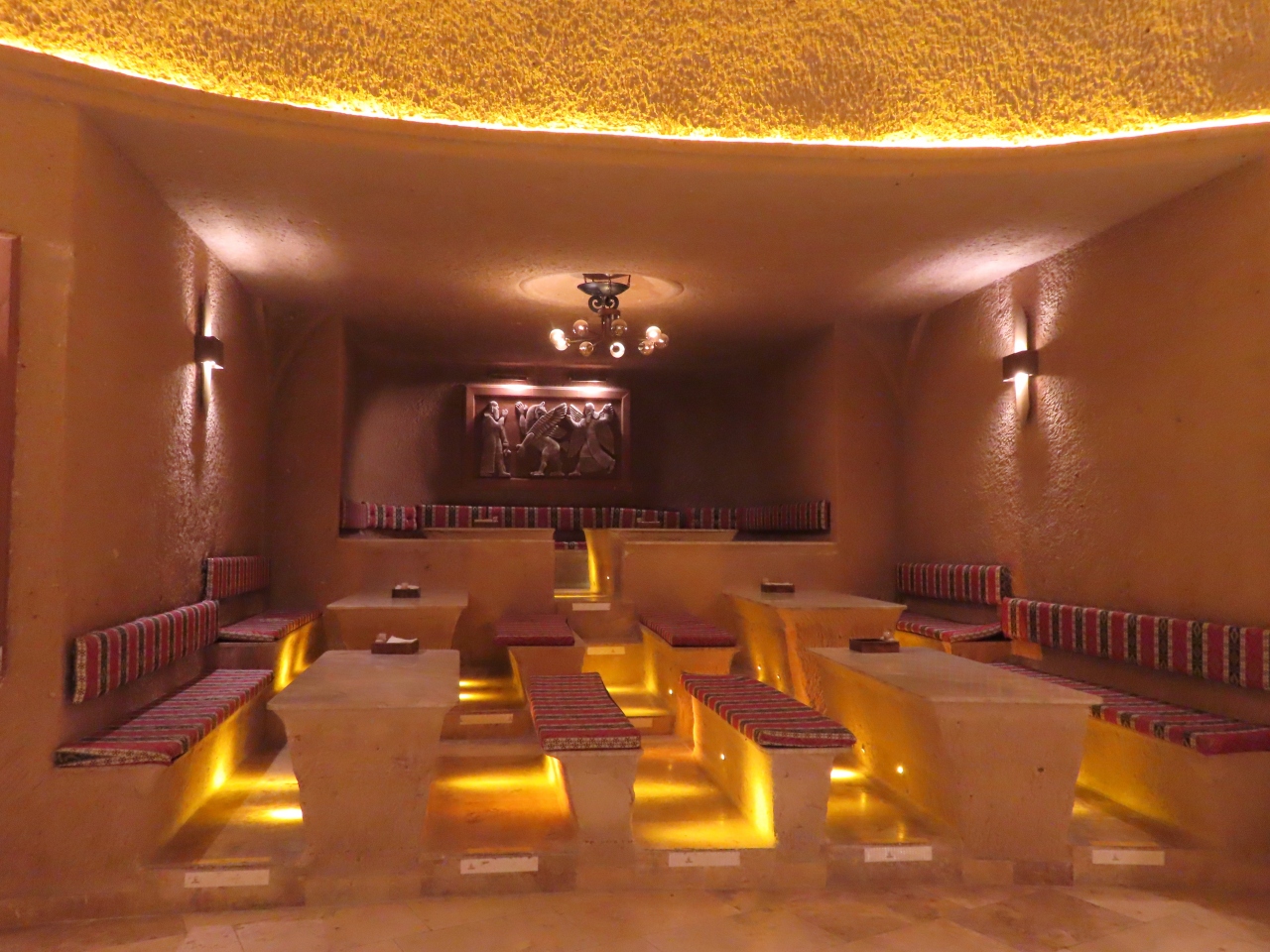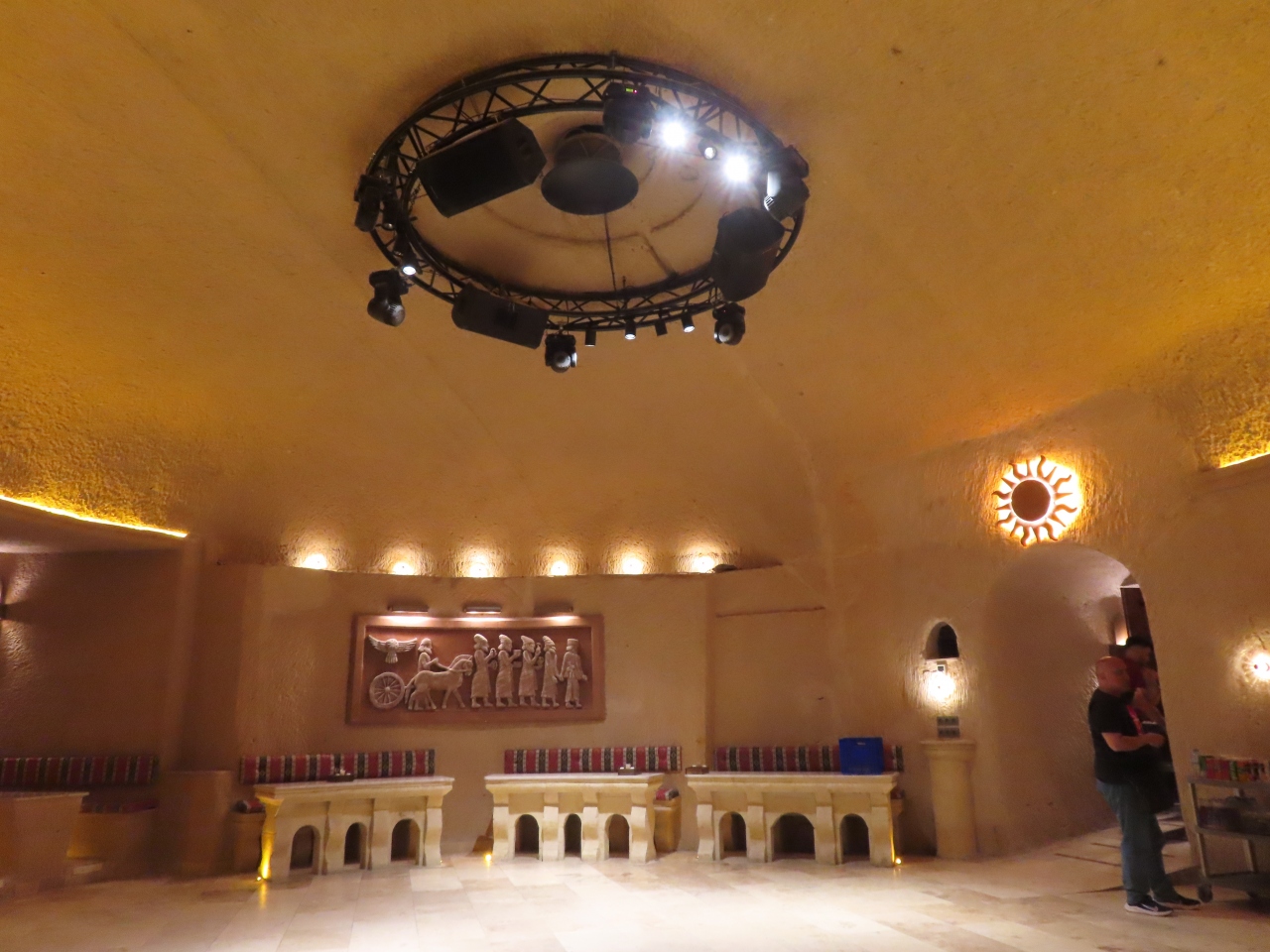 添乗員付きツアーにてディナー。岩盤をくり抜いてできたようなレストラン。テーブルもイスも石でできていて動かせないほど本格的。円周上に配置された客席の中央がそのまま舞台となり、ベリーダンスのショウが行われました。