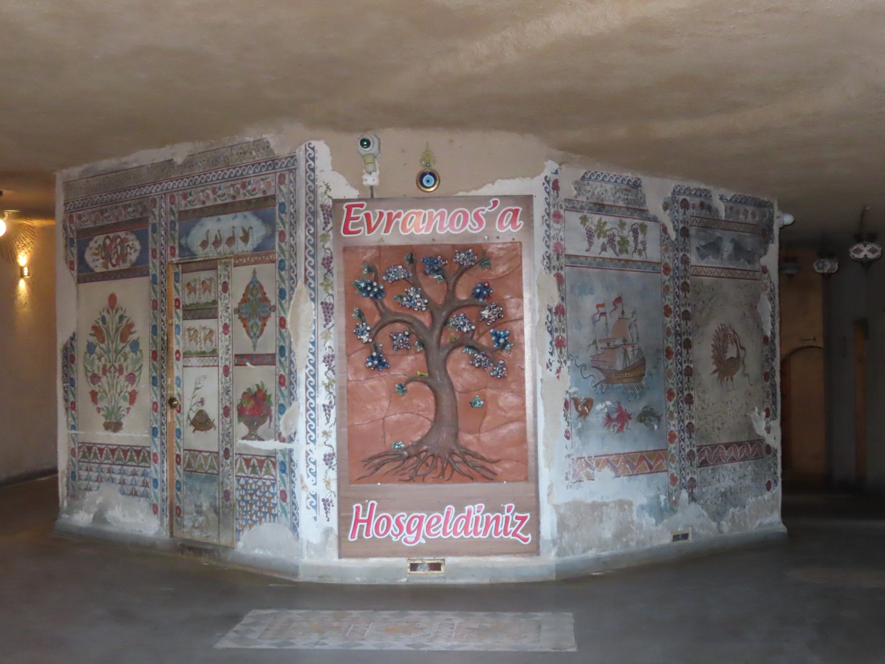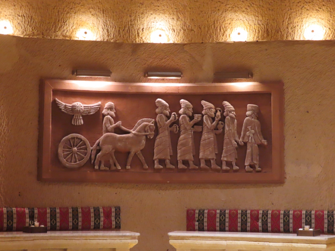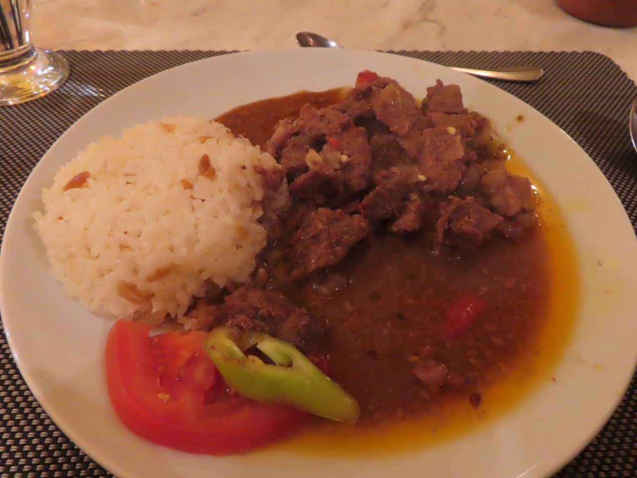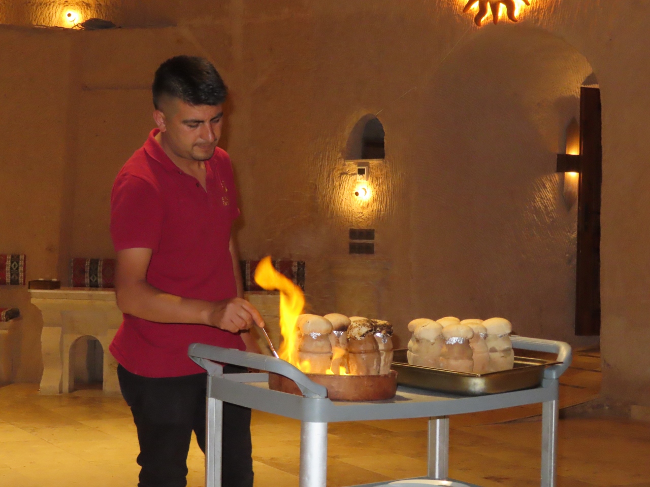 添乗員付きツアーにてディナー。岩盤をくり抜いてできたようなレストラン。テーブルもイスも石でできていて動かせないほど本格的。円周上に配置された客席の中央がそのまま舞台となり、ベリーダンスのショウが行われました。