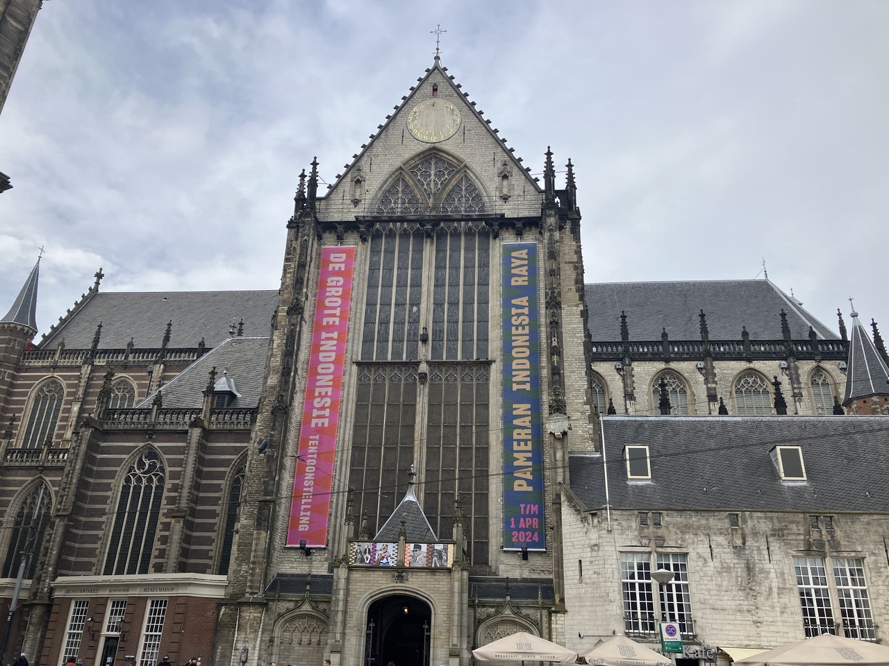 新教会は、後期ゴシック様式の建物で、王宮を正面に見て右手に位置しています。歴代のオランダ国王や女王の即位式あこの教会で行われるそうです。教会の建物正面にはピンク色の垂れ幕が掛かっていて、あまり教会っぽい感じがしないなと思っていたのですが、普段はイベント会場として使われているらしいです。