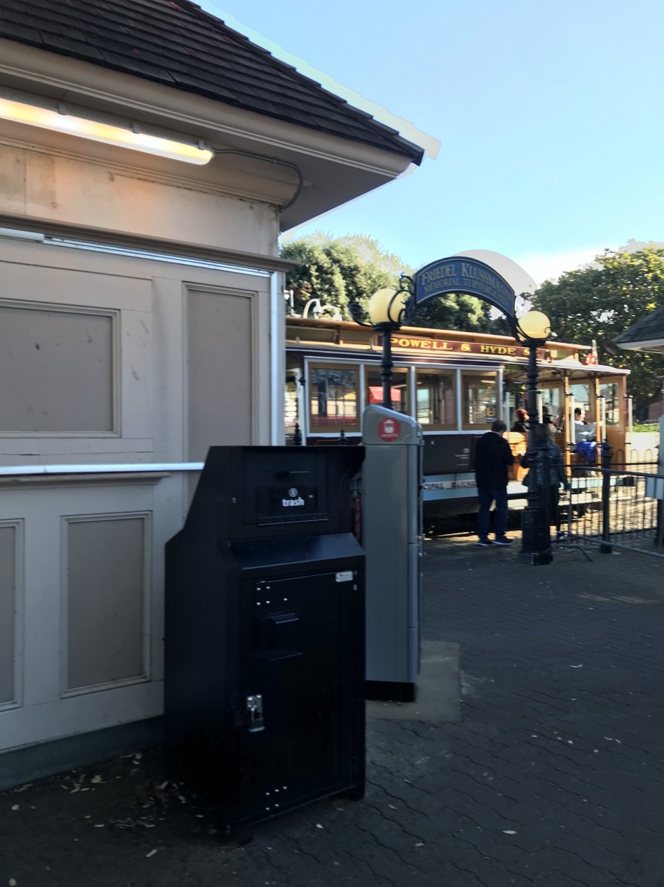 パウエルーハイド線のハイド側(フィッシャーマンズワーフ側)から乗車しました。12月上旬の訪問で観光客はそれほど多くはありませんでしたが、パウエル側は並んでいました。ハイド側は並んでいる人もおらず、すぐ乗れました。坂の街を楽に移動できます。風を切って進むので、比較的温暖なサンフランシスコでも冬は寒いです。