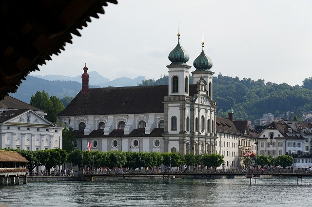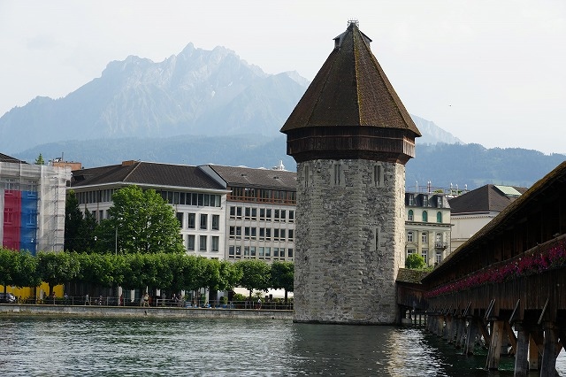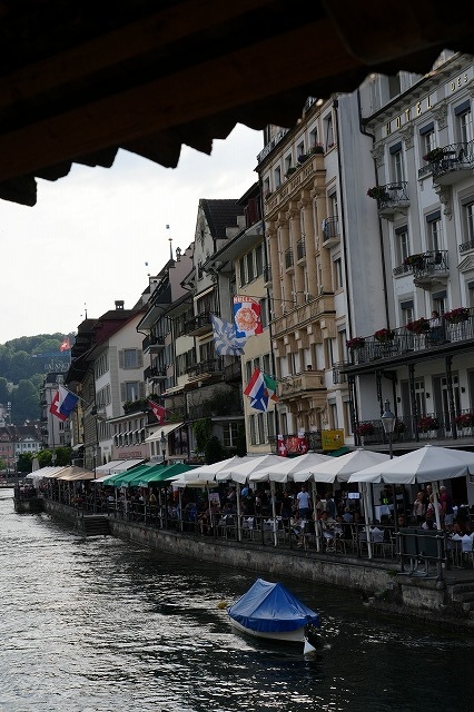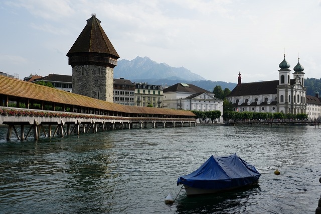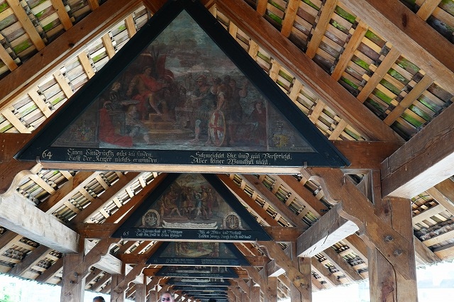 ルツェルンの市街を流れるロイス川にかかる中世からの歩道橋。90年代に火災で焼けて昔の儘再建されたもの。屋根がかかった歩道を歩いて渡るコースになっています。