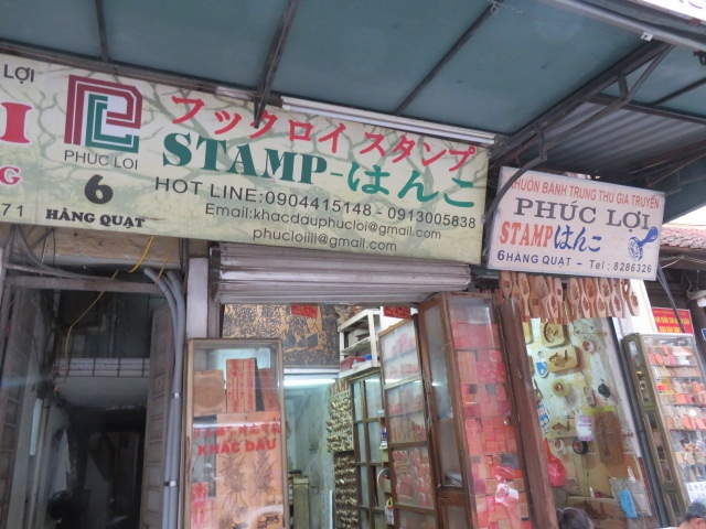 いわゆるホアンキエム湖の周辺の旧市街にあります。看板に日本語で「はんこ」と書かれていて、日本人向けというか観光客向けのお店で、対応も感じがいいです。好きな絵とか彫ってくれたりするので、お土産にいいと思います。