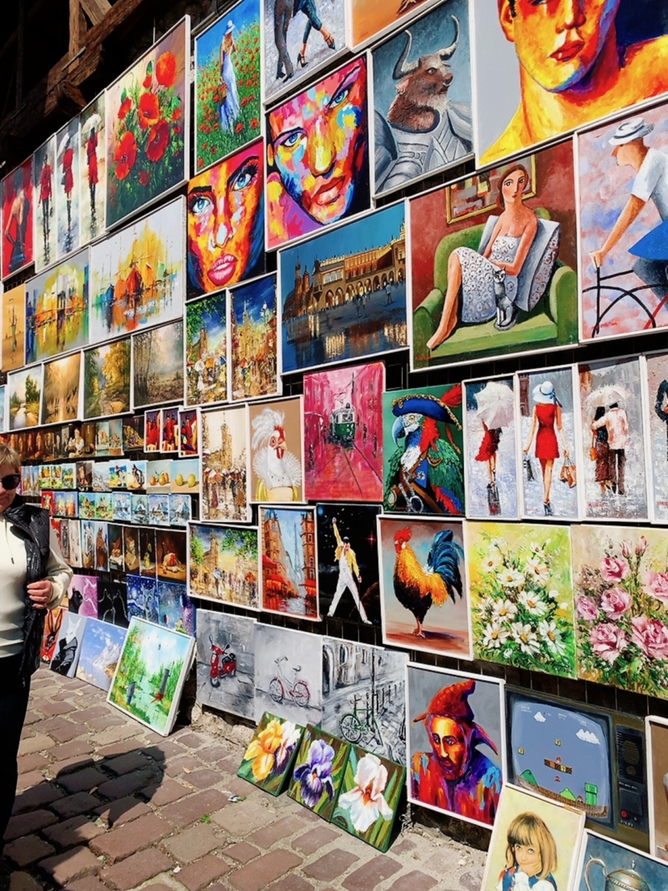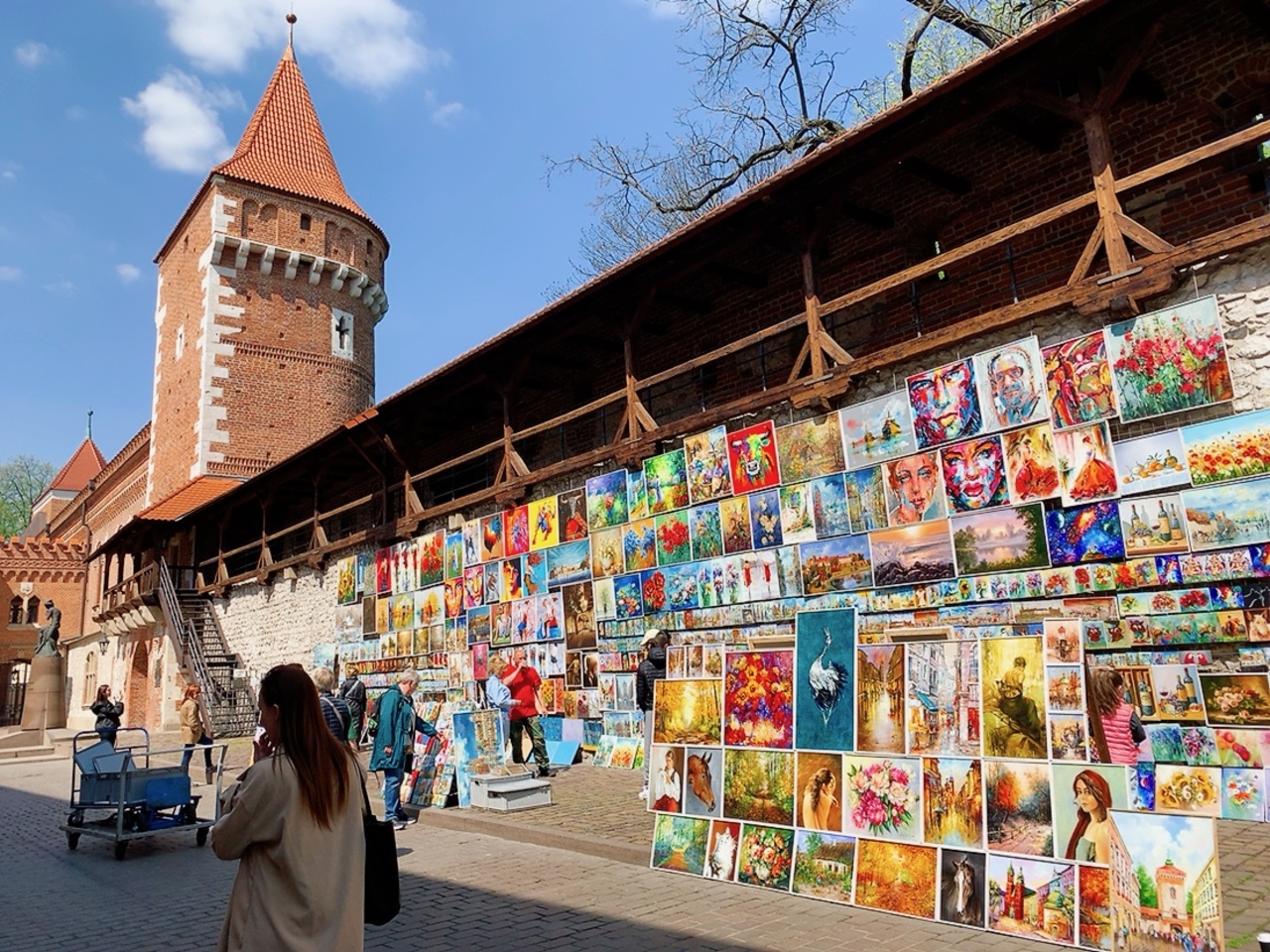 フロリアンスカ公園を越えて歩いていくと見えてきた塔が、フロリアンスカ門です。 周辺では、アーティストが描いた色々な絵が展示され、売られていました。 凄く芸術的な絵もあれば、中にはスーパーマリオを描いたカワイイ絵などもありました。 この通りは、観光客で賑わっています。