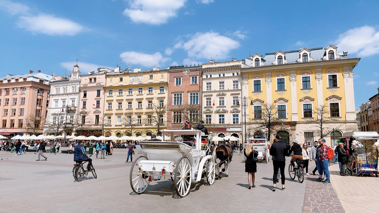 クラクフ本駅からも徒歩圏内だし、色々なトラム路線で近くまで行く事も出来る、名前の通り市内の中心地という感じ。 旧市街自体が観光スポットとして有名ですが、観光客を乗せた馬車が通ったり、お土産スポットの織物会館、クラクフ旧市街の1番のシンボルの聖マリア教会もあったり、どの角度からも写真映えするスポットでした。