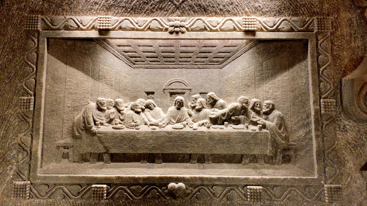 かなり歩いた後に、ヴィエリチカ岩塩坑の見学ツアーの1番の目玉でもある、キンガ礼拝堂に到着。 地下深い場所に広い空間があり、宮殿のような場所が作られている事が本当に凄いです。 岩塩で出来た、芸術作品「最後の晩餐」も見ることが出来て感動! 芸術家ではなくヴィエリチカの鉱夫たちの手によって作られた作品っていうのも凄いですよね!
