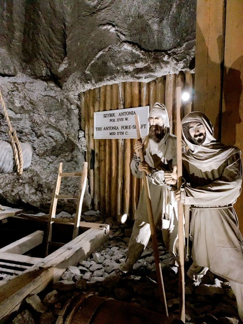 観光客向けの坑道は、岩塩で出来た歴史上や神話上の様々なモチーフを象った彫像がたくさんあります! 全ては坑夫たちが作ったものです! 後からどんどん出現する芸術作品に驚くばかり。 当時の岩塩坑で働いていた方々の様子がマネキンで表現されています。