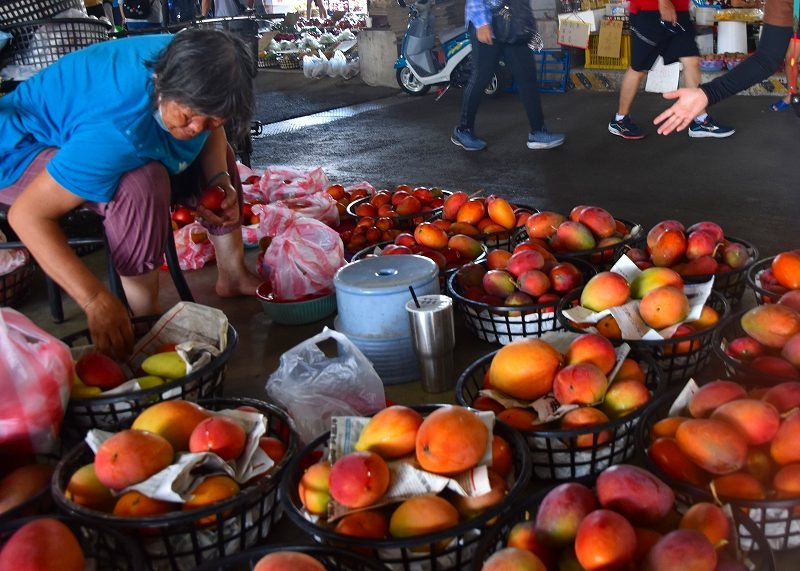 農家が運んできたトラックの上から小分けしたマンゴーの計量をしながら、おろしていく光景も見られた。ここに並ぶマンゴーは仲買人、小売人が買っていくため、売る単位はひと籠10個、20個と多い。観光客が1個、2個だけ下さいと言える場所ではない。市場から歩いて5、6分の街中へ行くと、切ったマンゴーを氷の上に載せて食べさせるマンゴーカフェが何軒かあった。