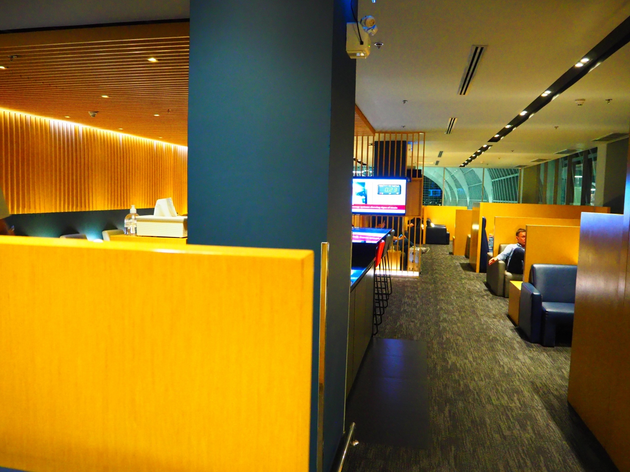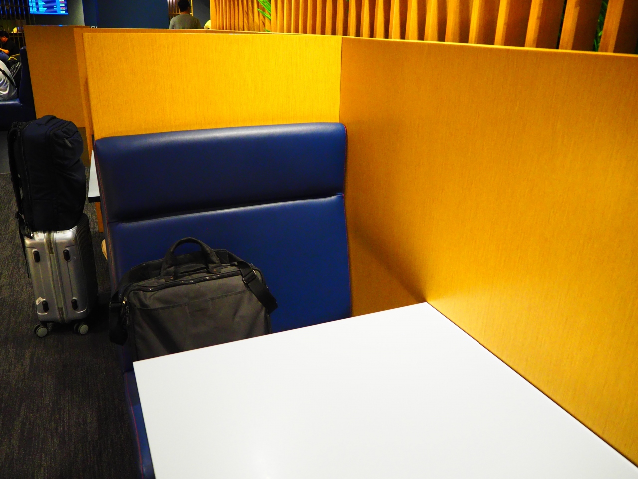 PPを利用して初めて利用しました。深夜便の搭乗待ちで結構混んでいましたが、二人掛けのテーブルが少しだけ空いていてうろうろすることなくテーブルは確保できました。テーブルごとに少し高めのパーテーションで区切ってあるので、それなりにプライバシーは保たれます。