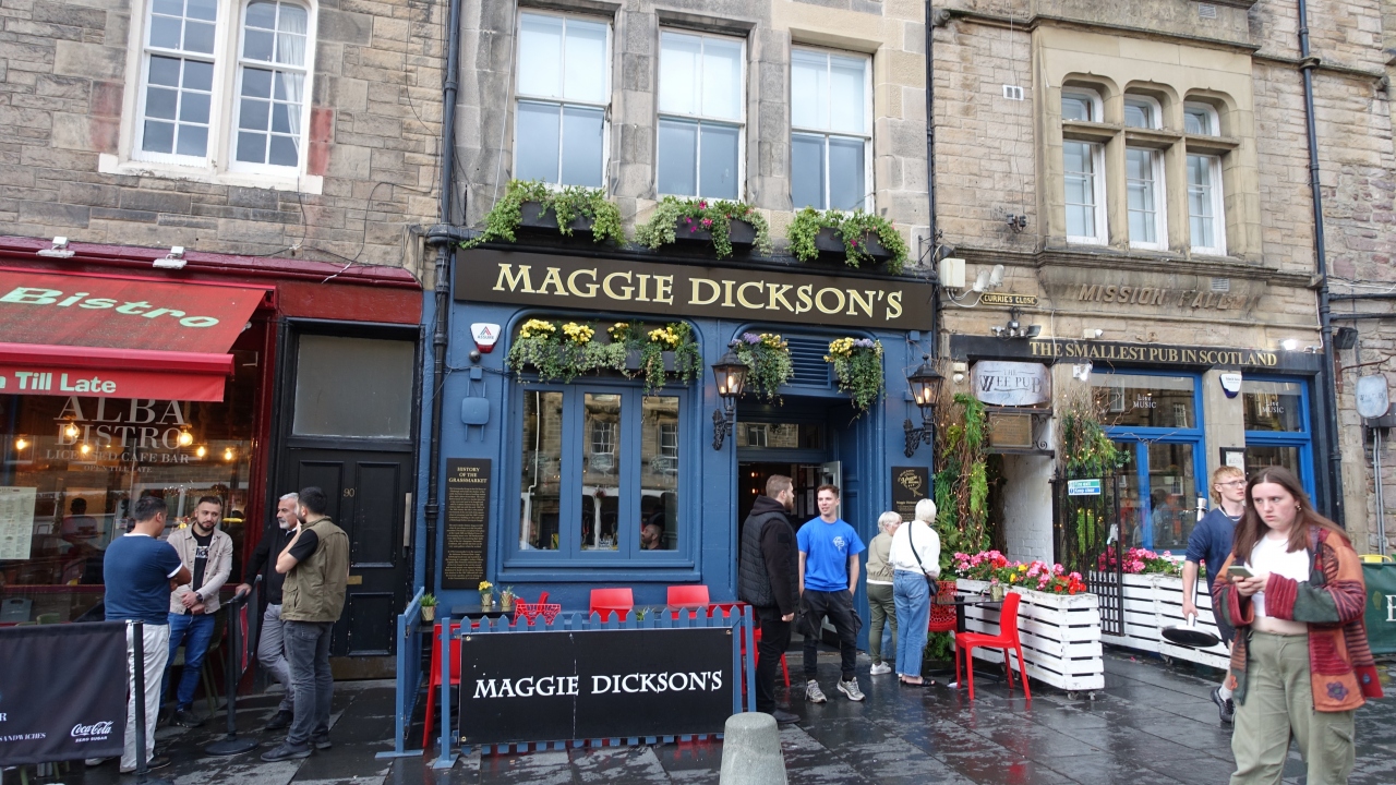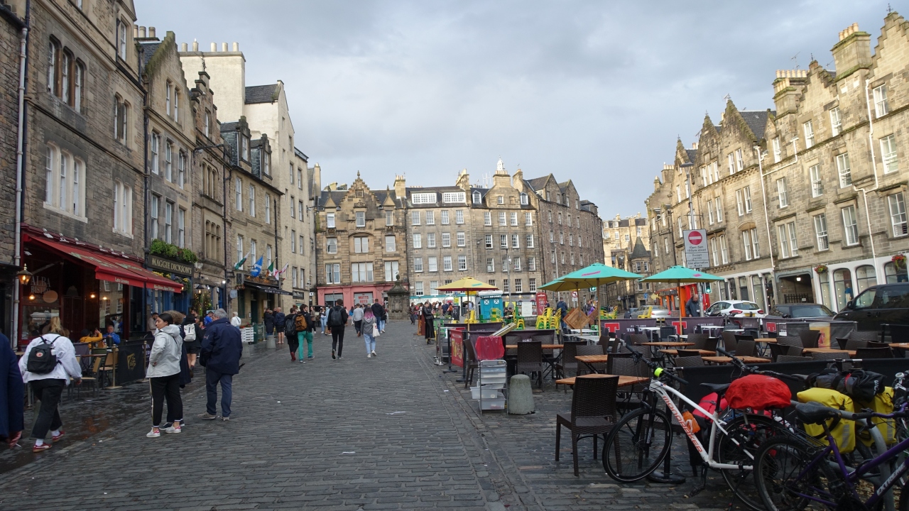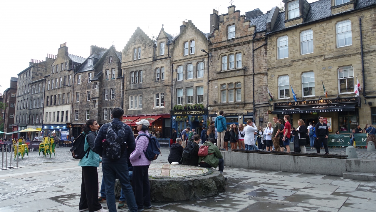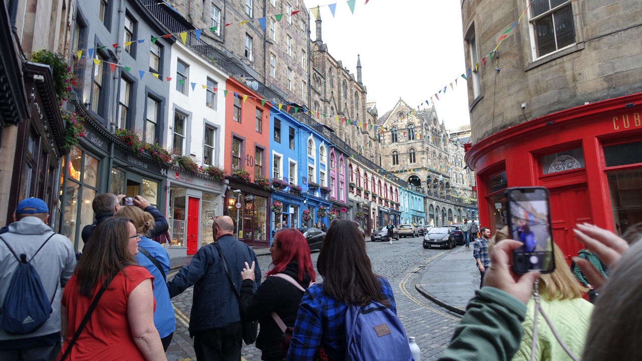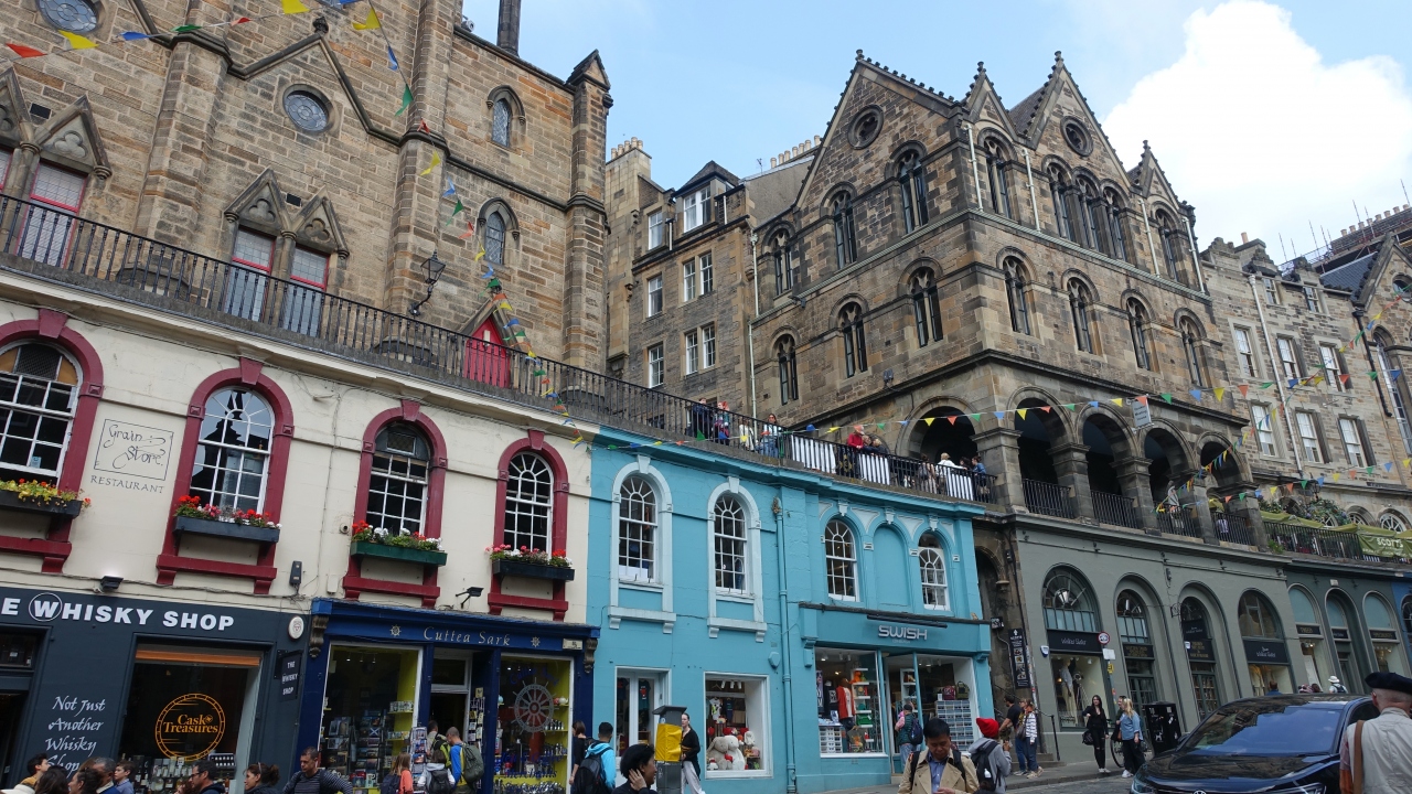 ここからロイヤルマイルに至るウェストボウ通りとビクトリア通りには、19世紀に建てられたカラフルな建物とその上に建つ重厚な石造りの建物が続き、ことのほか美しい。