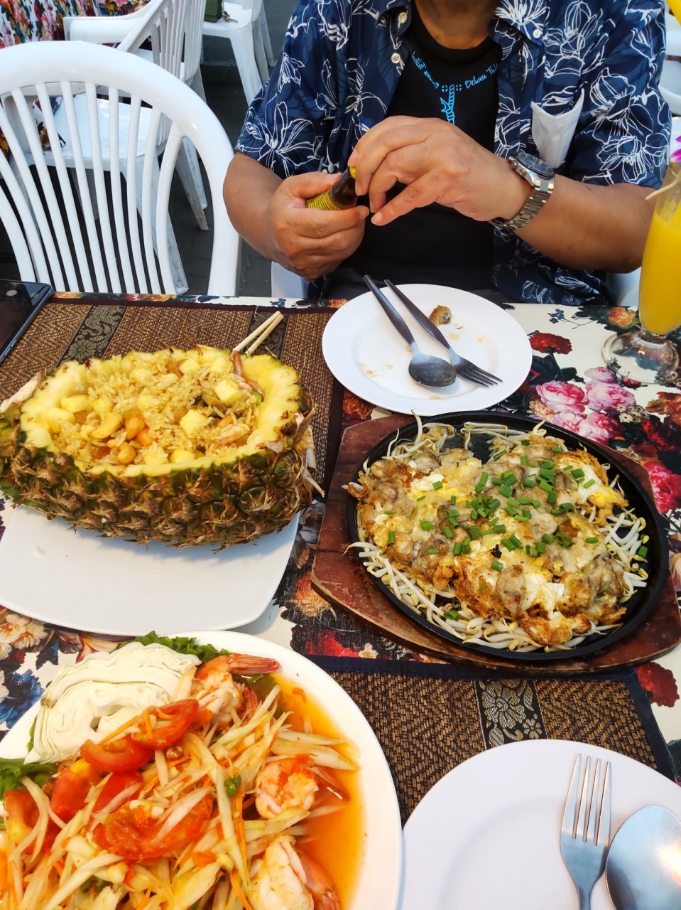 個人的な意見ですが、味は料理によってバラツキがありました。パイナップル炒飯は美味しかったですが、オースアン(牡蠣、モヤシ、卵の炒め物)は味が無い💢まあ、タイの調味料4点セット(唐辛子、砂糖、酢、ナンプラー)やチリソースで自分で味付けすればよいのでしょうけれど、チョッと面倒、、。
