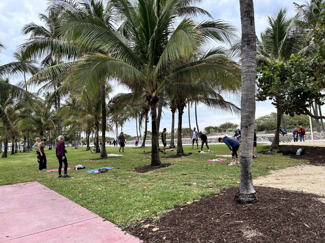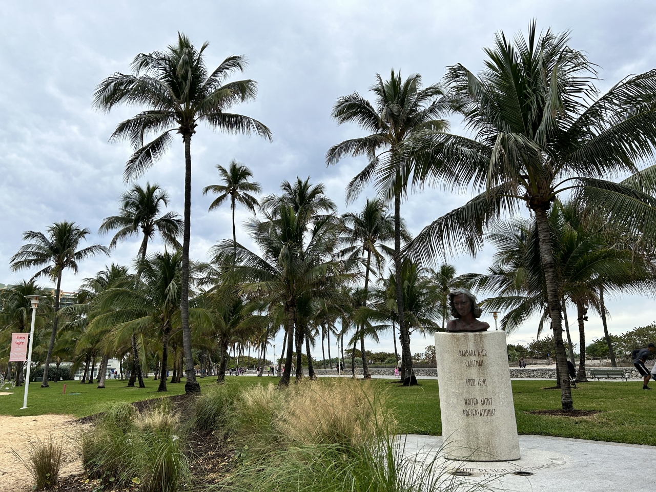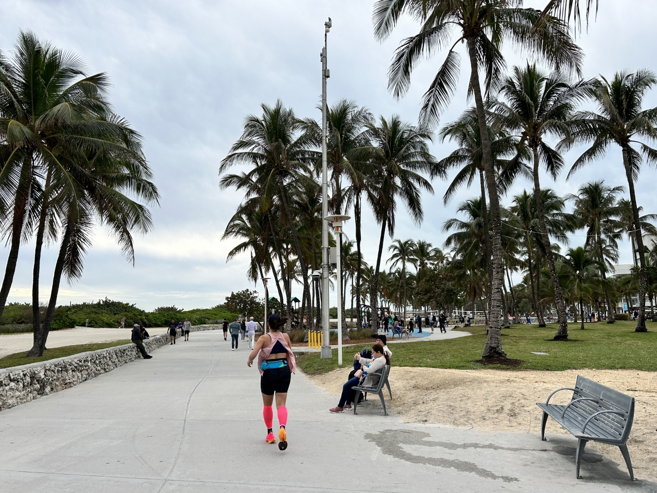 マイアミ・ビーチの長い砂浜に沿って遊歩道が整備されており、多くの人が散歩・ジョギング・サイクリングを楽しんでいました。砂浜を歩いている人もたくさんいますが、遊歩道の方が歩きやすく、ところどころに公園、草木や木々、芝生、モニュメントなどがあるので、歩いていて気持ち良いです。