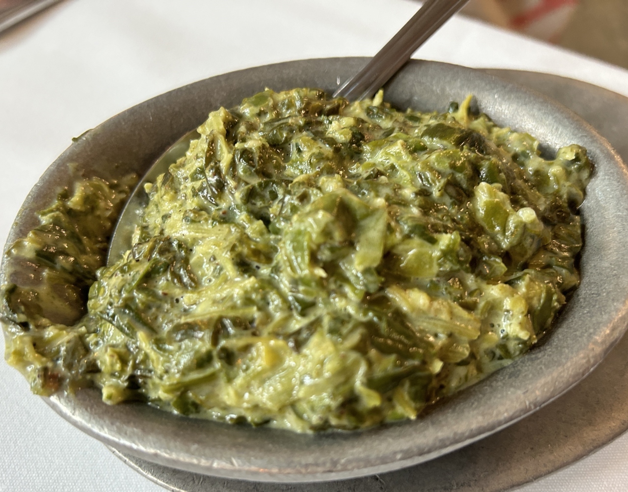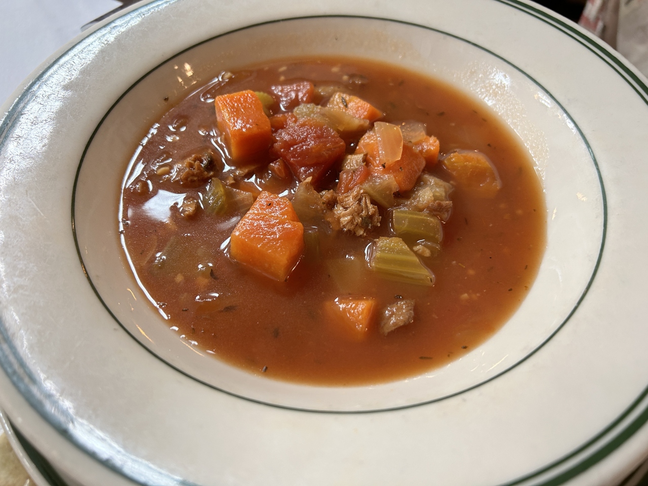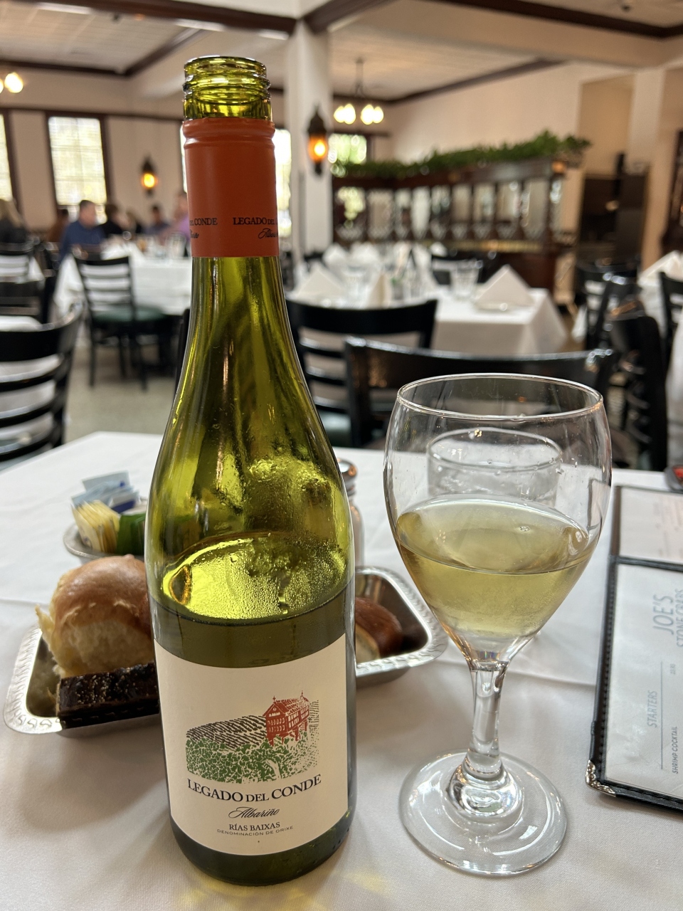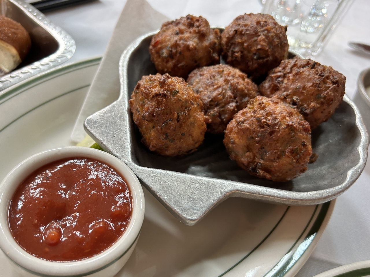 ワインは私たちが大好きなスペイン・ガリシア地方のリアスバイシャス産、アルバリーニョ(ぶどう種)の白がありましたので迷わずチョイス、ワインの種類は豊富です。アピタイザーに、トマトベースの「マンハッタン風クラムチャウダー」、オーダーしたのは1人前でしたが2つ皿を用意し取り分けてシェアサーブしてくれました。1つの量が多いのでありがたいです。「コンチのフリッター」はコンク貝という巻貝をすりつぶしてフライしたもの。カリブ海周辺のご当地グルメらしい。さらに「ジンジャー・サーモン」にクリーム・スピナッチを添えて。