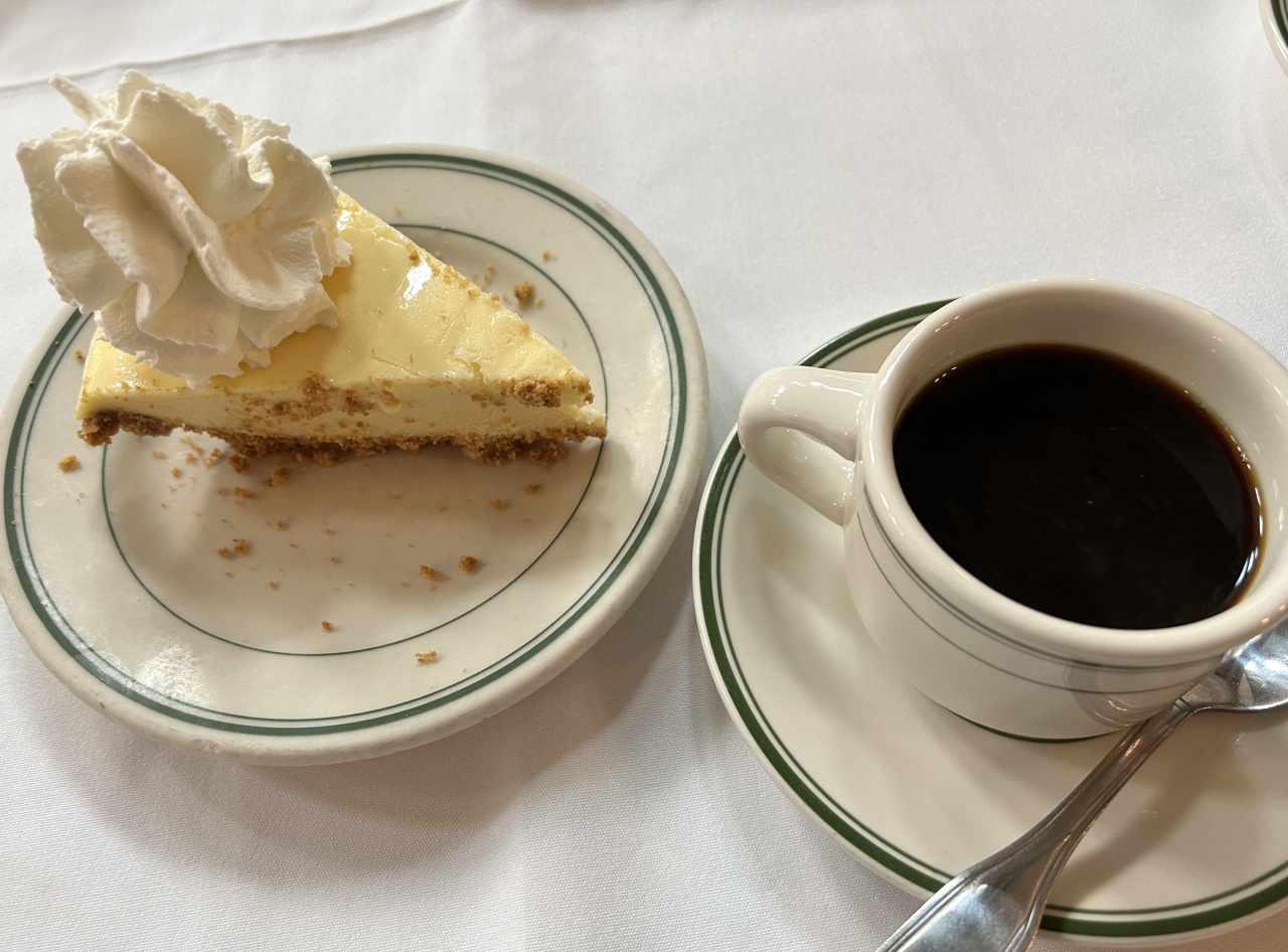 本命の「ストーン・クラブ」、米国東海岸を含む北大西洋西部で獲れる蟹です。収穫した蟹から爪だけを取って海に戻し、爪の再生を促すという漁法なのだそうです。ですので、こうして爪だけが出てくるのです。爪の先を持って、特製ソースを付けて、かぶりつきます。蟹の旨味が詰まったプリプリでボリューミーな一品…これは美味いです!デザートに「キー・ライム・パイ」とカフェ。