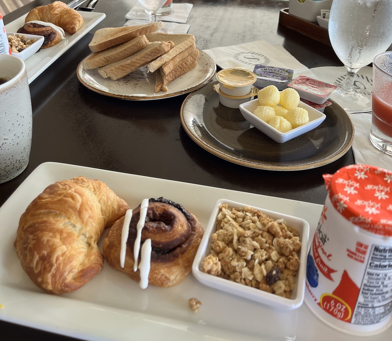 マリオット・ボンヴォイのプラチナエリートの特典で、朝食をいただきました。テイクアウトも選べて便利ですね。レストランでもいただきました。眺めもよくて気分がいいですね。レストランでいただいたときは、パンが選べて、パンだらけでした。
