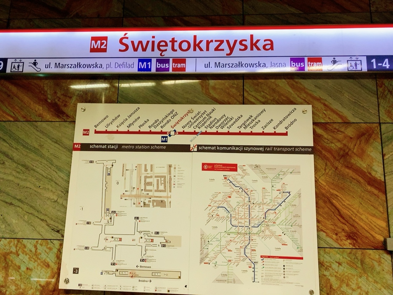 M1, M2の2路線しかない、シンプルなワルシャワの地下鉄。 相互乗り換えは、Centrumのお隣のSwietokrzyska駅で出来ます。