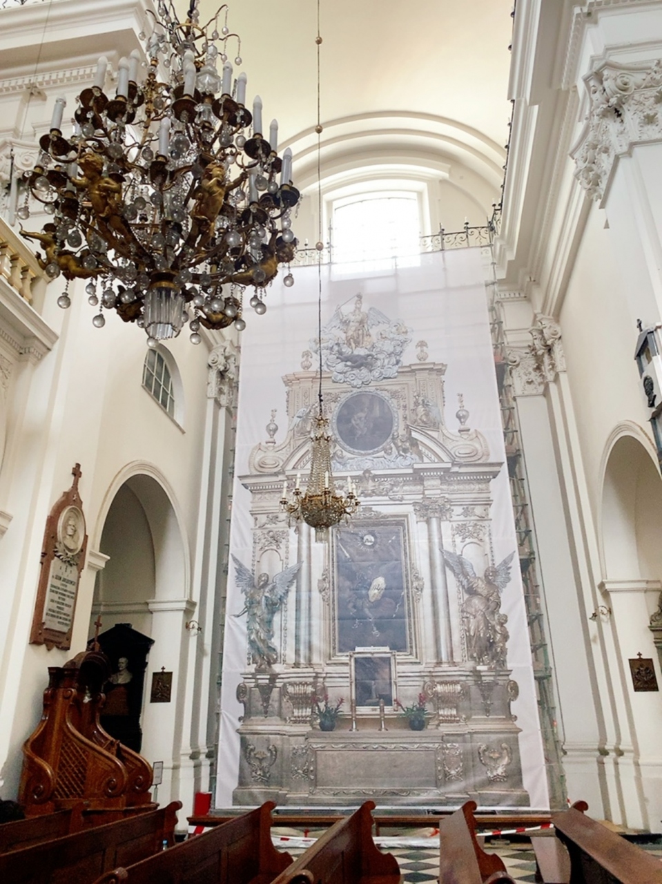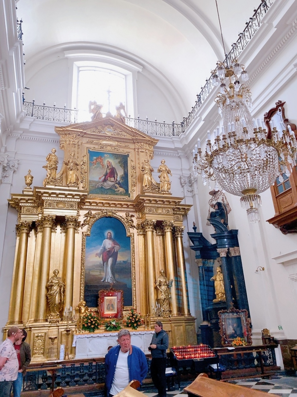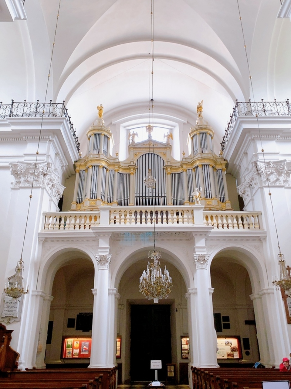 再建された聖十字架教会は、白を基調とした、厳かで美しいバロック様式の教会です。