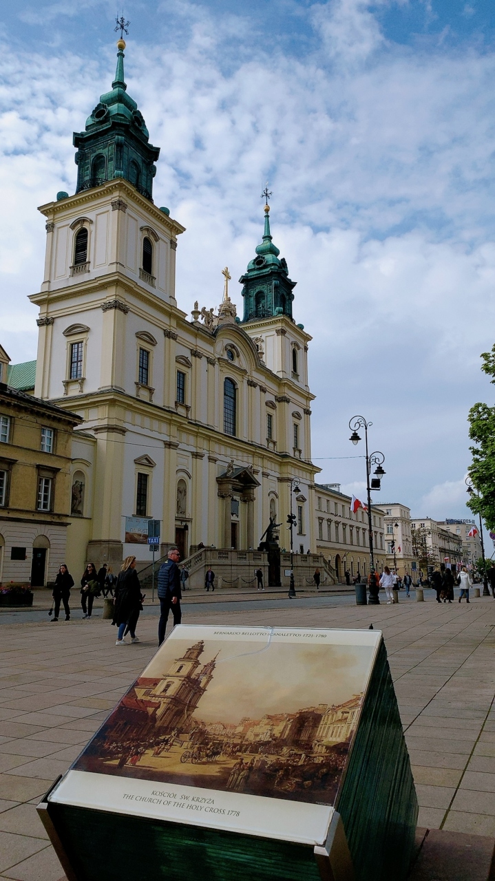 旧市街の入口に、17~18世紀のワルシャワの町並みのスケッチがタイルに描かれたものが飾られてて、それに描かれた聖十字架教会と、現在の聖十字架教会は外観がソックリです。 第二次世界大戦で町全体が壊滅的な被害を受けたため、ワルシャワのほぼ全ての建物は第二次世界大戦後に復元されました。