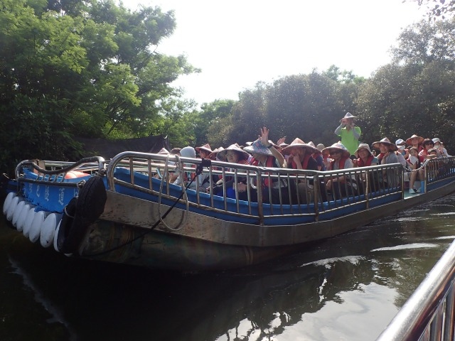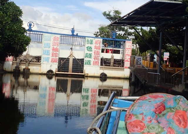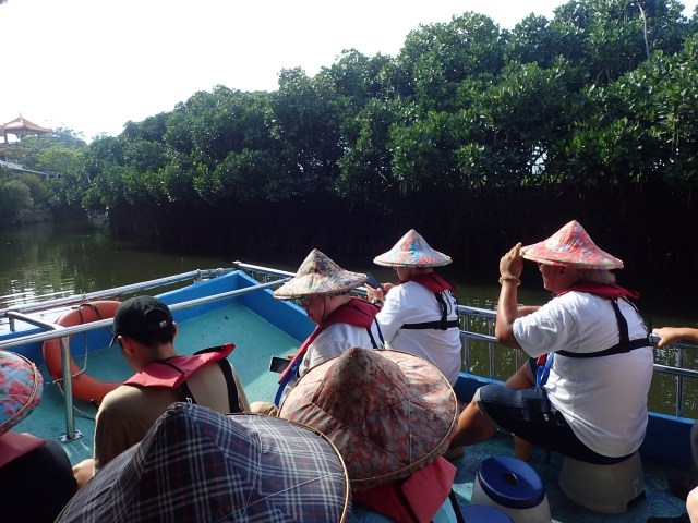 大人一人200元(950円ほど)。頭上を緑が茂ってトンネル状態になった川を往復するそうだ。平らな船に乗り、救命胴衣をつけて、いざ出発。客はざっと40人ほど。左右にはマングローブが生い茂り、南の街、台南の風情にあふれている。