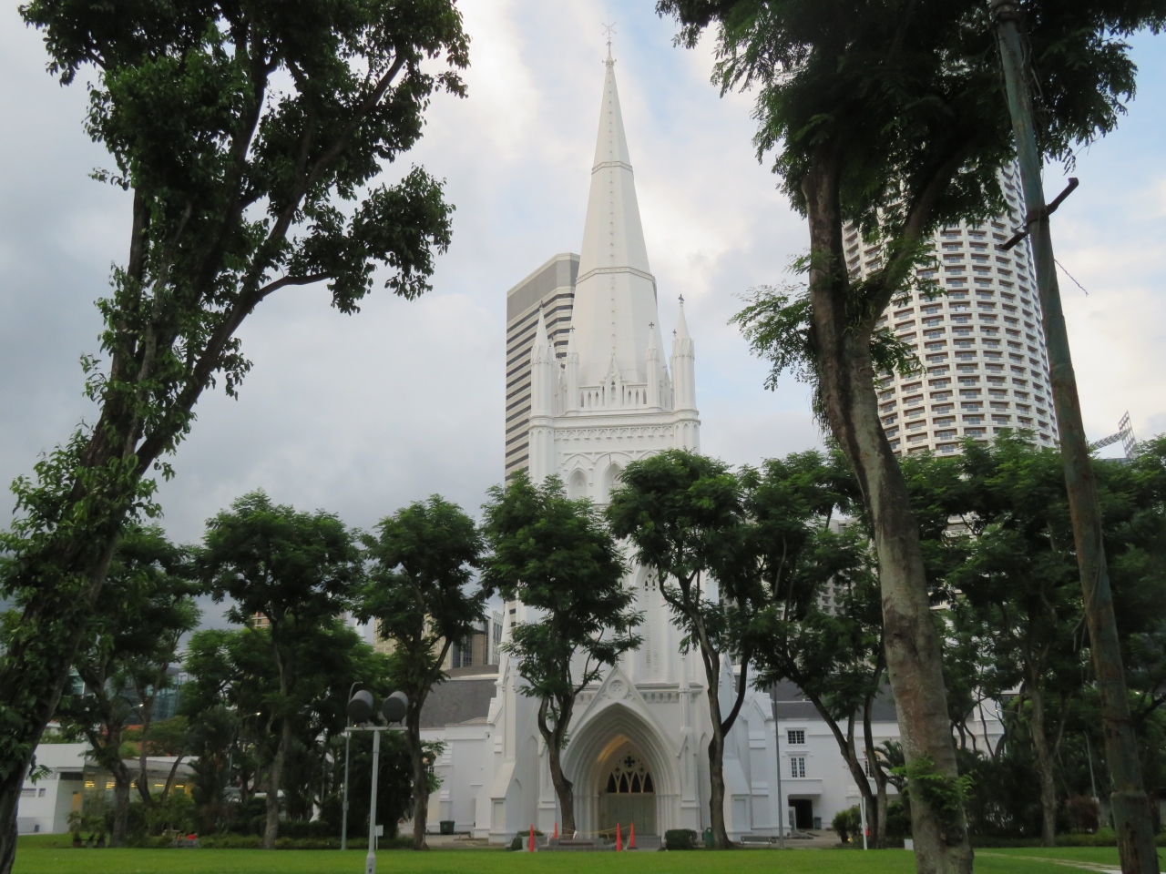 イギリス統治時代にラッフルズ卿が指示して建てたという英国国教会。教会の周りは芝生があり公園のようになっているのですが、すぐ近くには近代的なビルがあり、教会の白い尖塔がキレイで目立っていました。ただ時間外だったので中は見学できず外観のみとなりました。ステンドグラスをみたい方は時間を確認して行ってください。