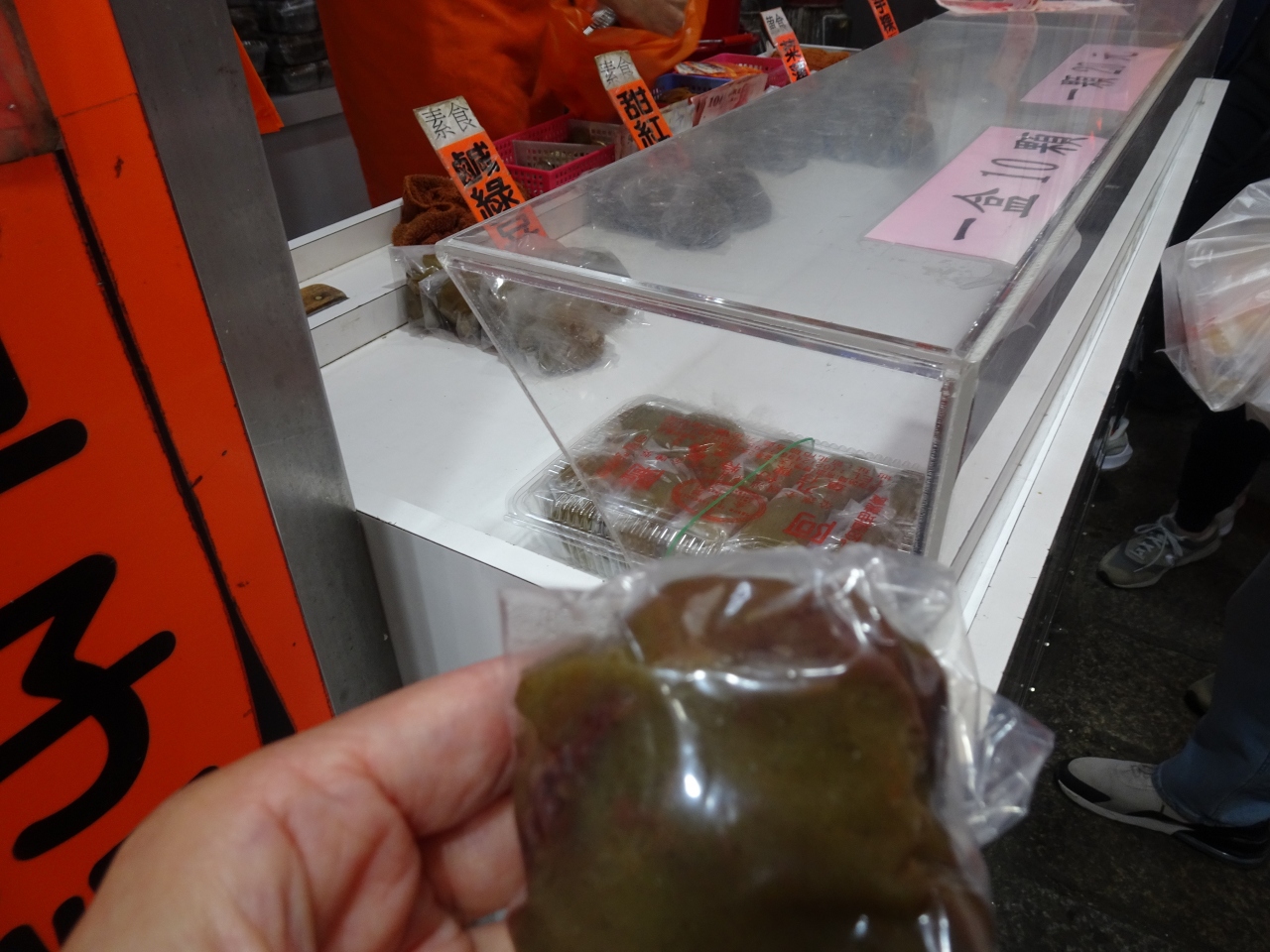 もち米で作る台湾の伝統的なおやつ・草仔果で、干しエビと切干しダイコン入りの菜蒲、甜紅豆(小豆餡)、鹹緑豆、鹹菜(高菜)の4種類ありました。