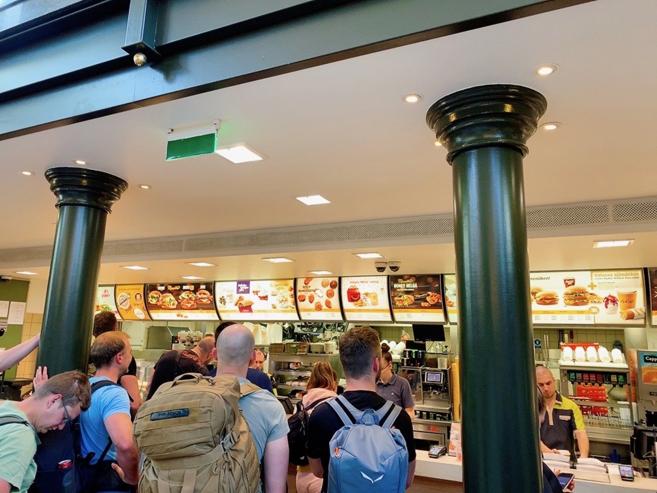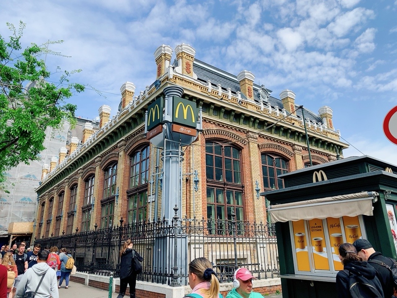 ブダペスト西駅から徒歩数分の場所にある、まるで宮殿のような建物。 小さくマックのMマークも付いてます。 店内は確かに世界一美しいマクドナルドと言われる理由が分かるわ!という感じのステキな内装でした。 色々な国の観光客が写真だけ撮りに来てる姿も見えました。