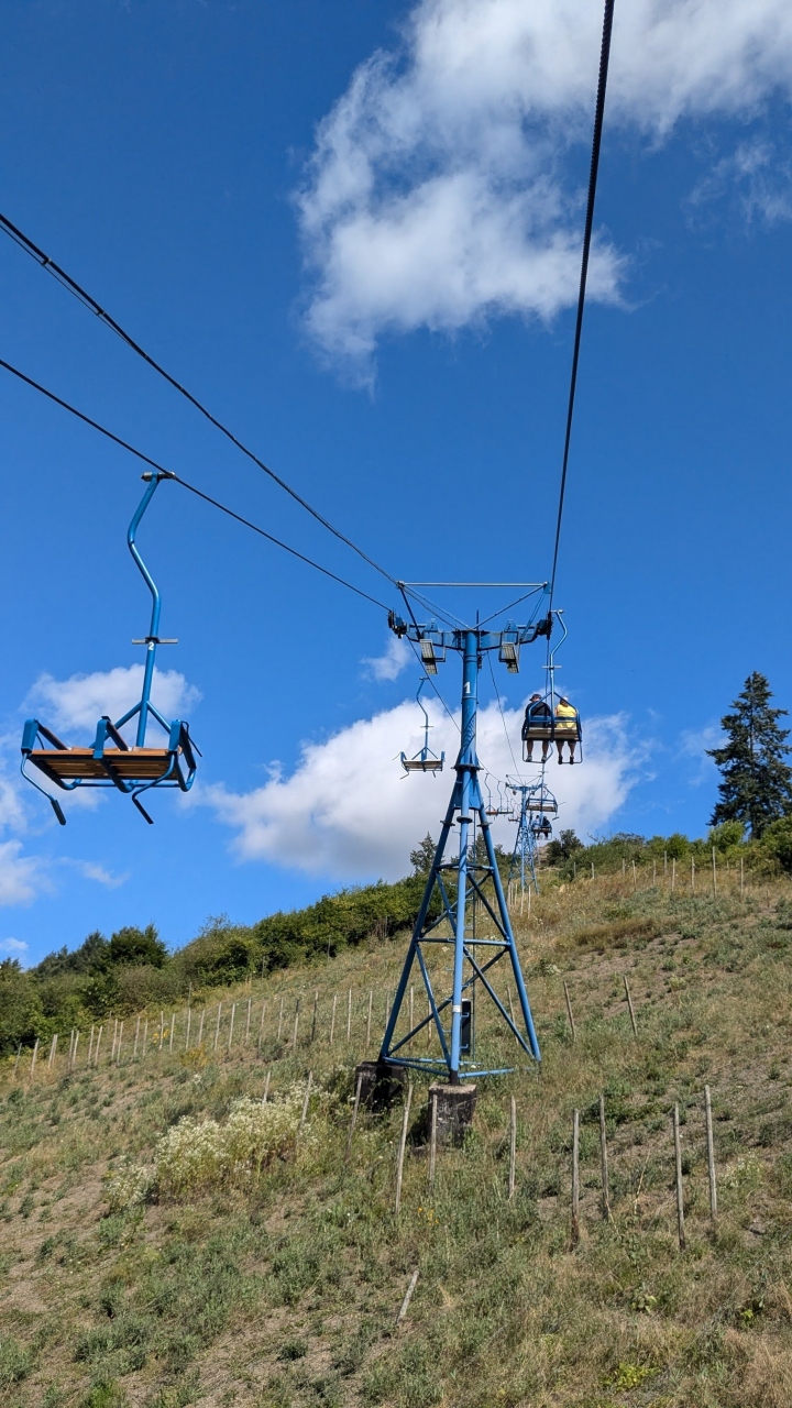 行った日は7月中旬でした。半袖で少し暑いくらいの気温でしたが、チェアリフトで上がるにつれ風が吹いて寒いので乗る前に上着を着た方がいいです。20分ほど昇って行く途中で4回ほど止まりましたが、リフトから荷物を下ろすのに少し停止するそうです。知らなければ故障かと思い焦ってしまう。こんなに長く乗るリフトのは初めてなので風も眺めもすべて楽しかったです。